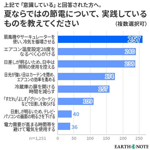 「節電を常に意識している」「節電を時々意識している」と回答した477人に「夏ならではの節電について、実践しているもの」を尋ねたところ、以下の結果となりました。