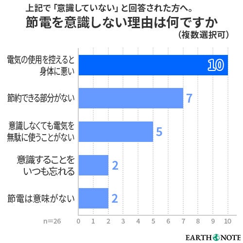 「節電を意識していない」と回答した23人に理由を尋ねた結果、1位は「電気の使用を控えると身体に悪い」となりました。2位は「節約できる部分がない」が続きました。