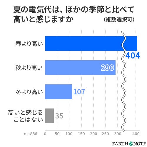 夏の電気代について、春より高いと答えた人は500人中404人(80.8%)、秋より高いと答えた人は500人中290人(58%)という結果になりました。やはり電気代が高いと感じるのは、夏場と冬場のようです。