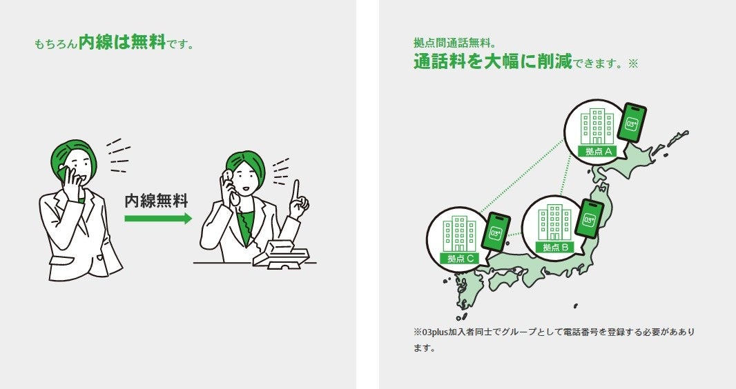 「03plusエンタープライズ」はクラウドPBXサービスと電話回線が一体化した、30名以上の中小~大企業向けのクラウドPBXサービスです。従来のクラウドPBXサービスのように、別途電話回線の契約・⼯事は不要で、ゲートウェイ機器等の設置も不要なため、最短即⽇からクラウドPBXを導⼊できます。従業員のスマホにアプリをインストールするだけで会社の電話番号(03や06など主要46局の市外局番)で電話ができるようになり、企業のクラウドPBX導入時の手間とコストを削減します。
