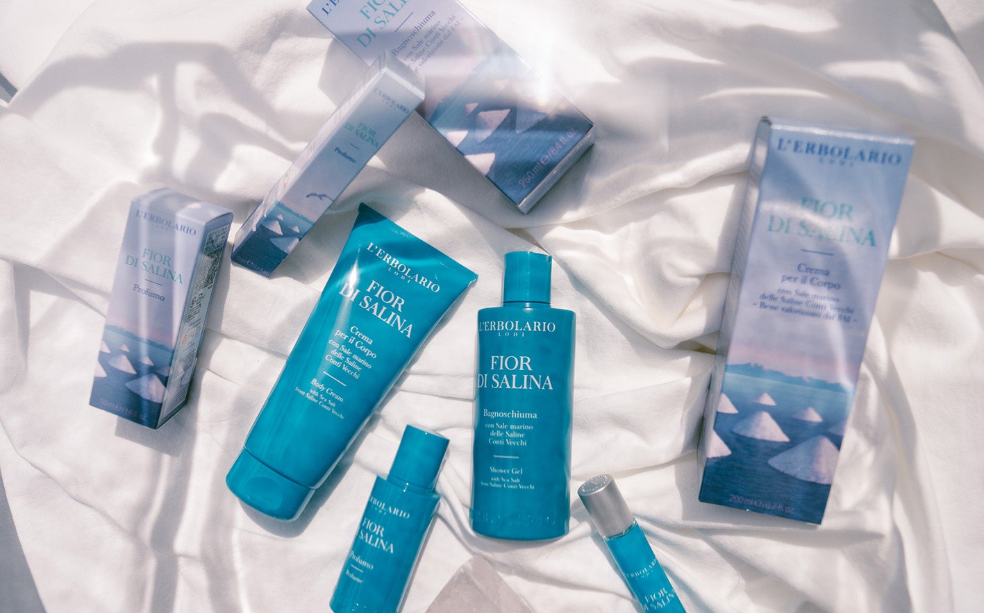 地中海に浮かぶサルデーニャ島にある自然の中の塩田、サリーネ・コンティヴェッキから届く海塩をモチーフにしたボディケア&フレグランスのコレクション。静かな塩田のほとりに佇んでいるような爽やかなマリンノート。シャワージェル、ボディクリーム、オイルスクラブ、パフューム、ルームディフューザーの全5種のラインナップです。
