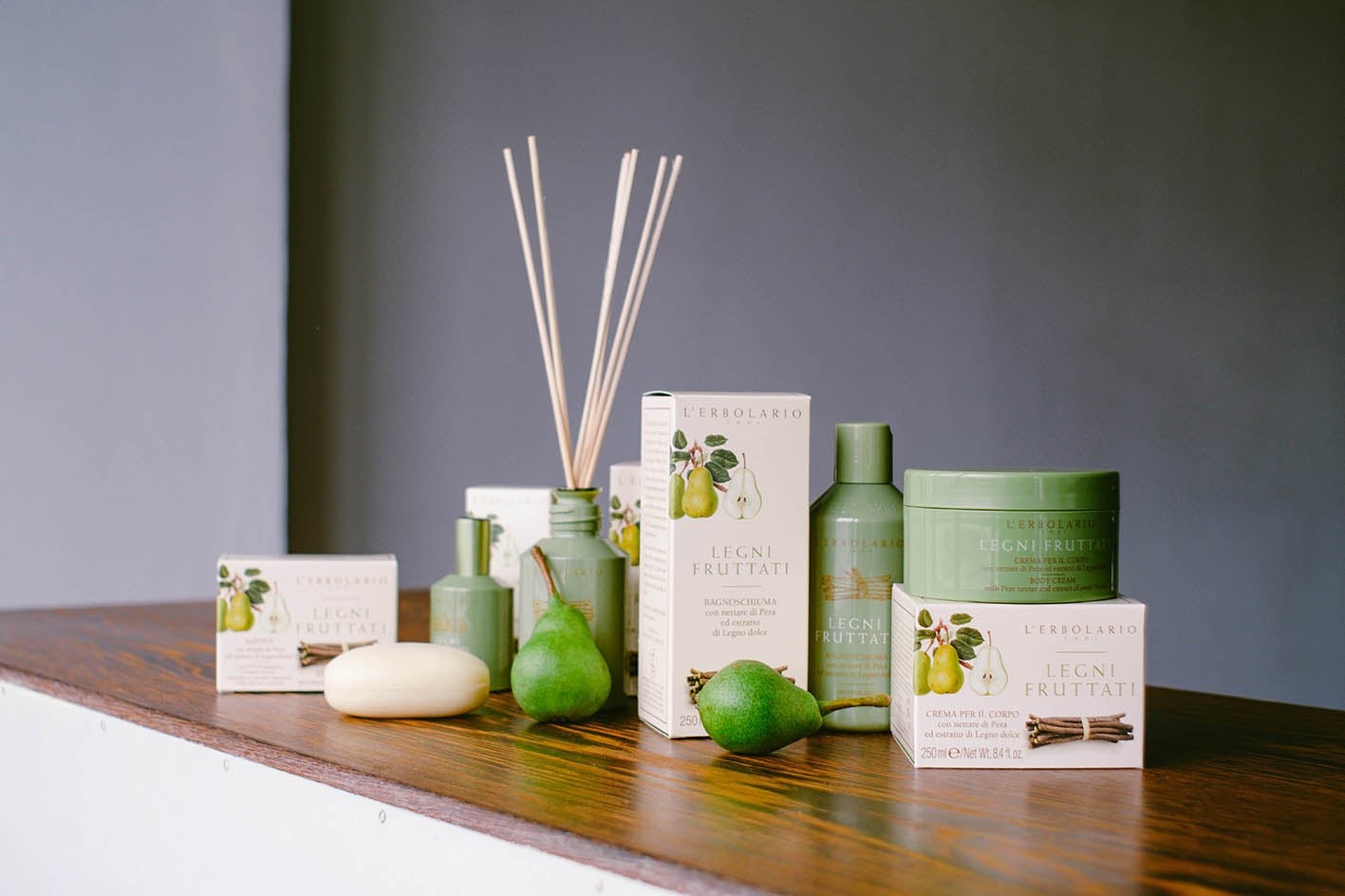 洋ナシの甘くフルーティーな香りとリコリスのウッディな香りが融合した、フレッシュノートが楽しめるコレクション。洋ナシの果汁(セイヨウナシ果汁)や、リコリスの根から抽出されるエキス(カンゾウ根エキス)がお肌を整え、うるおいで満たします。シャワージェル、ボディクリーム、ソープ、パフューム、ルームディフューザーの全5種のラインナップです。