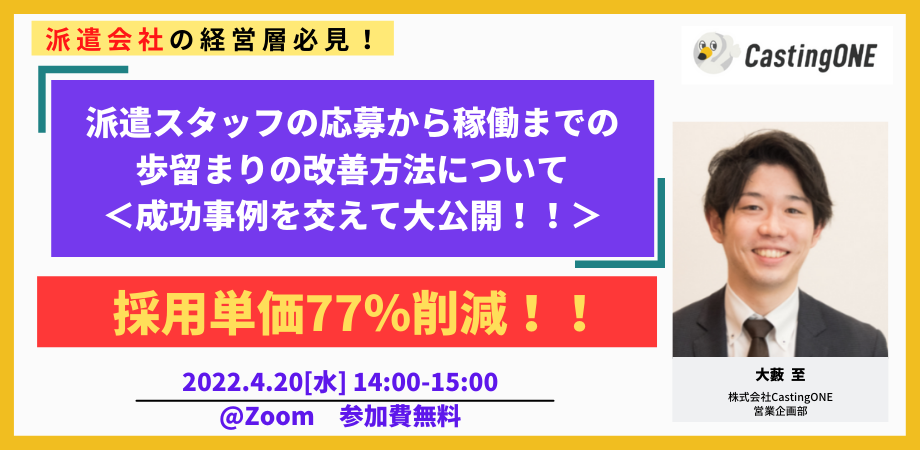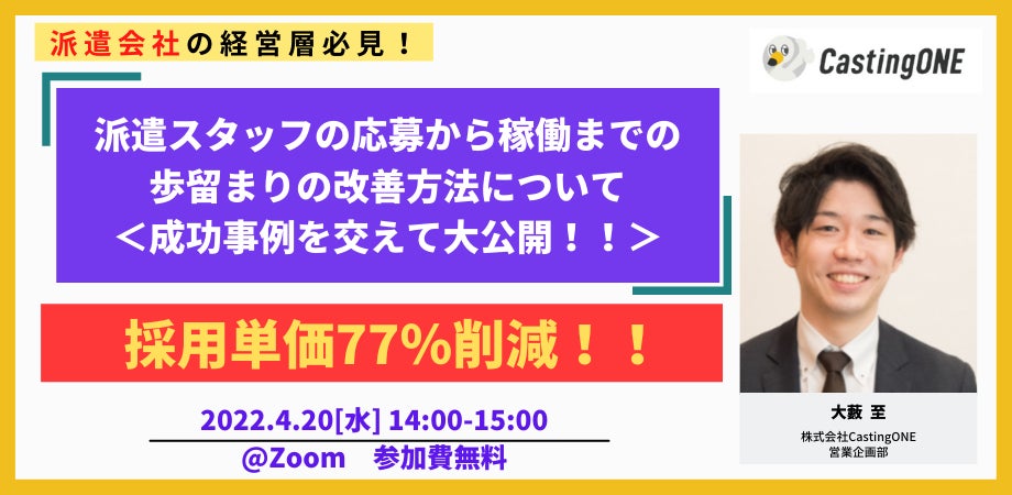 【無料ウェビナー】採用単価77%削減!派遣スタッフの応募から稼働までの歩留まりの改善方法について<成功事例を交えて大公開!!>4月20日(水)14時~無料ウェビナー