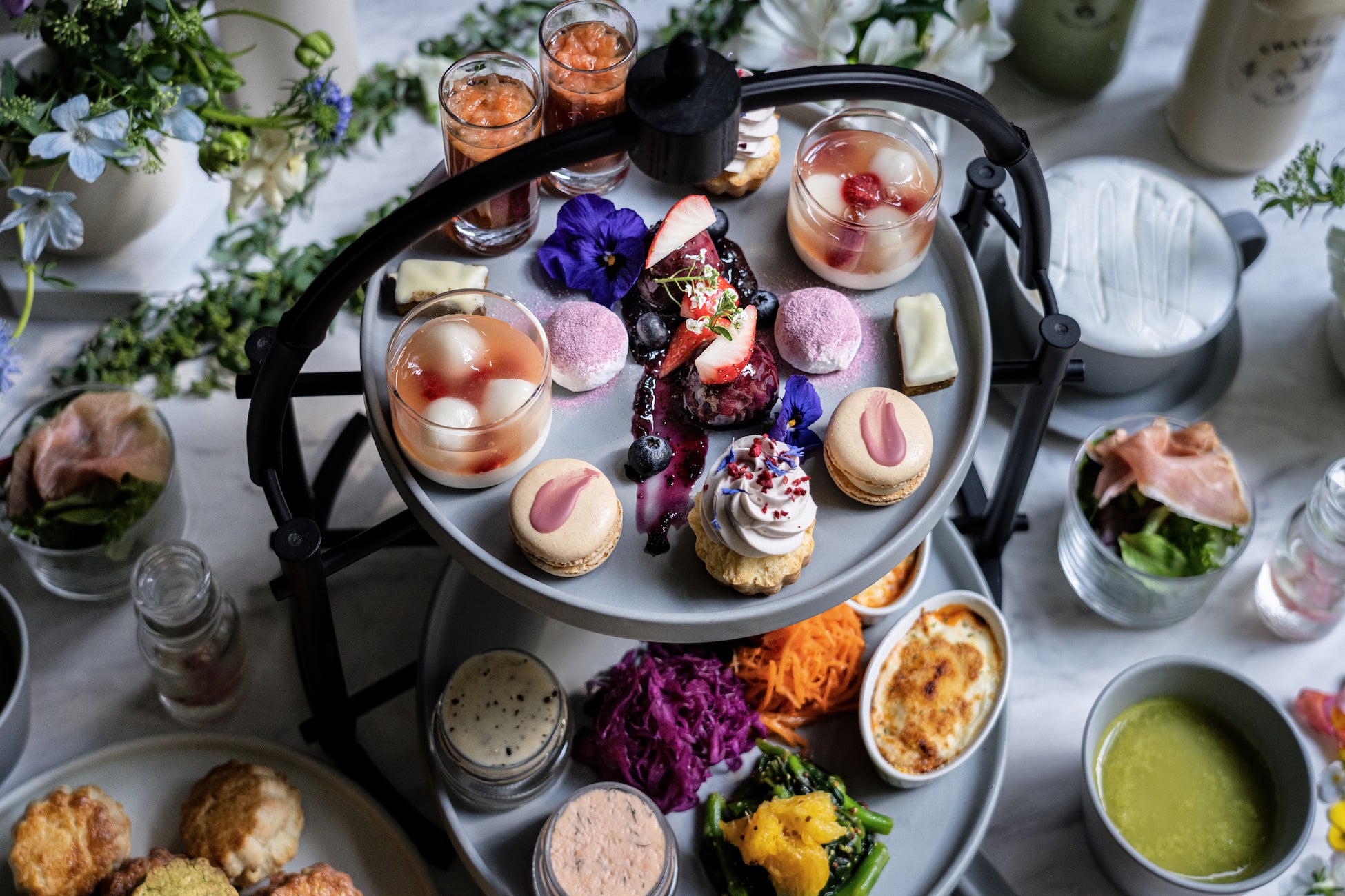 ベルガモットが上品に香るアールグレイはグレープフルーツと合わせ、透明感と軽やかさに満ちた口当たりの良いジュレにしました。柑橘の爽やかな香りとジューシーな果実味の立体的な味わいが魅力です。カモミールは白桃のとろける甘いソースと合わせ、淡いピンクに深みのある華やかな味わいが春にふさわしい、白玉入りのぜんざい仕立てにしています。すみれとルビーチョコレートのガナッシュタルトは、ルビーチョコレートのフルーティーな甘さに、すみれの香りが印象的に漂うフローラルな口溶けを合わせました。和洋を掛け合わせた、つぶ餡とブルーベリーのおはぎや、有機レモングラスをパウダーにして使用した香り豊かなスノーボールなどもお楽しみいただけます。セイボリーには、菜の花とオレンジのマリネやハニーナッツ&ドライフルーツのキャロットラペの他、桜花を浮かべた、桜が香るドレッシングでお楽しみいただく、生ハムとグリーンハーブのサラダや、緑が鮮やかなグリーンアスパラのポタージュなどをご用意しております。