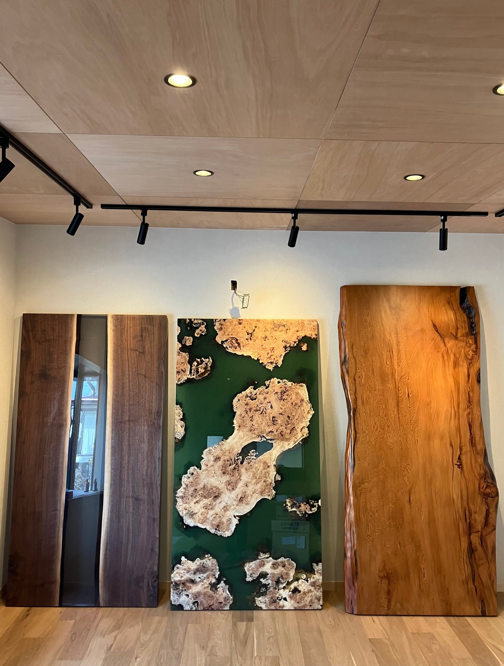 (1) 無垢一枚板・レジンテーブルから荒木の原木まで展示。