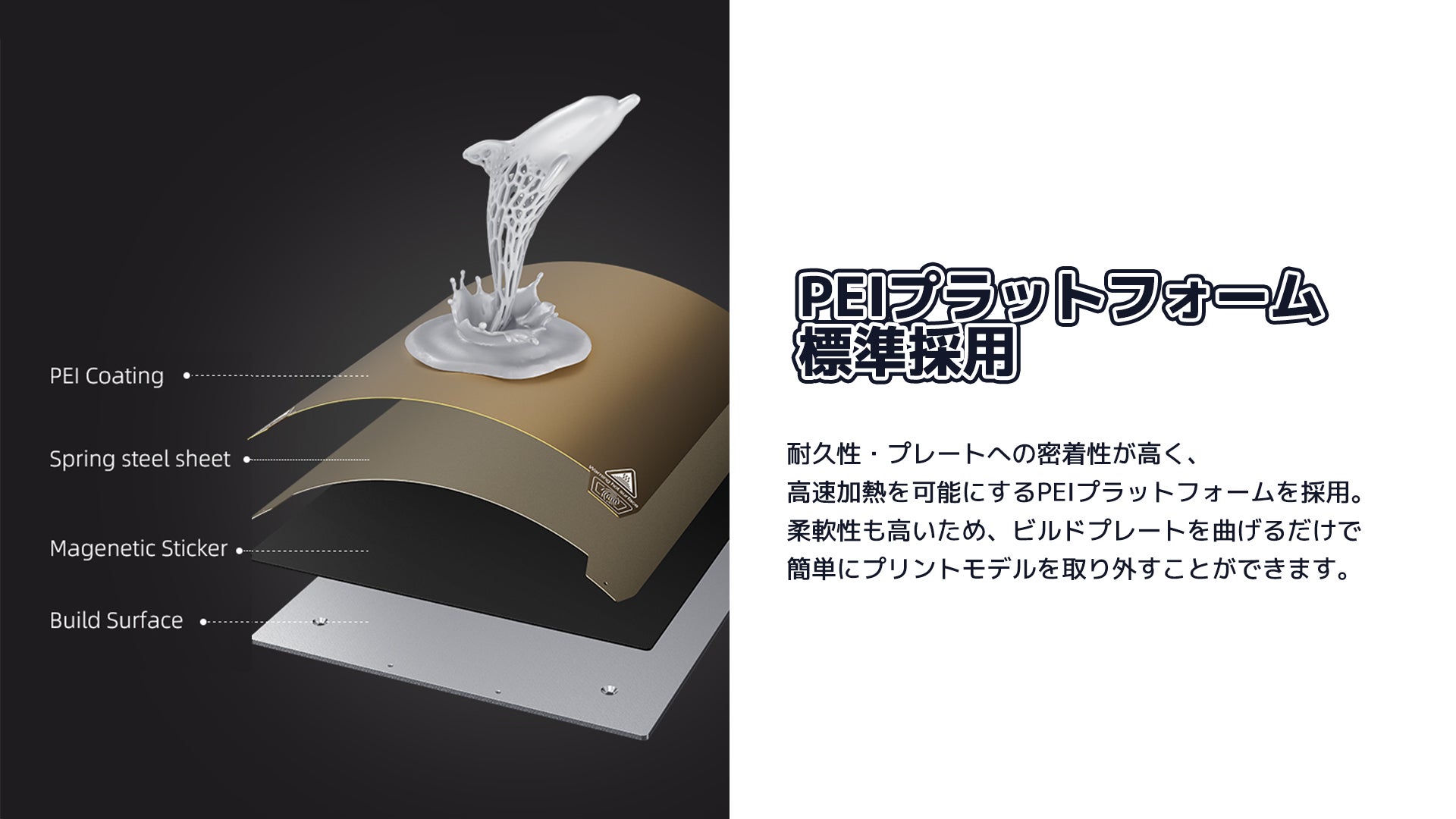 LEDライト・次世代プラットフォーム(PEIプラットフォーム)・高耐熱ノズル採用・カラータッチパネル採用で、さらに使いやすく、様々な樹脂での造形が可能に
