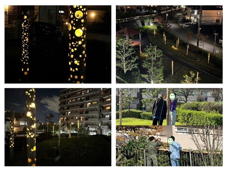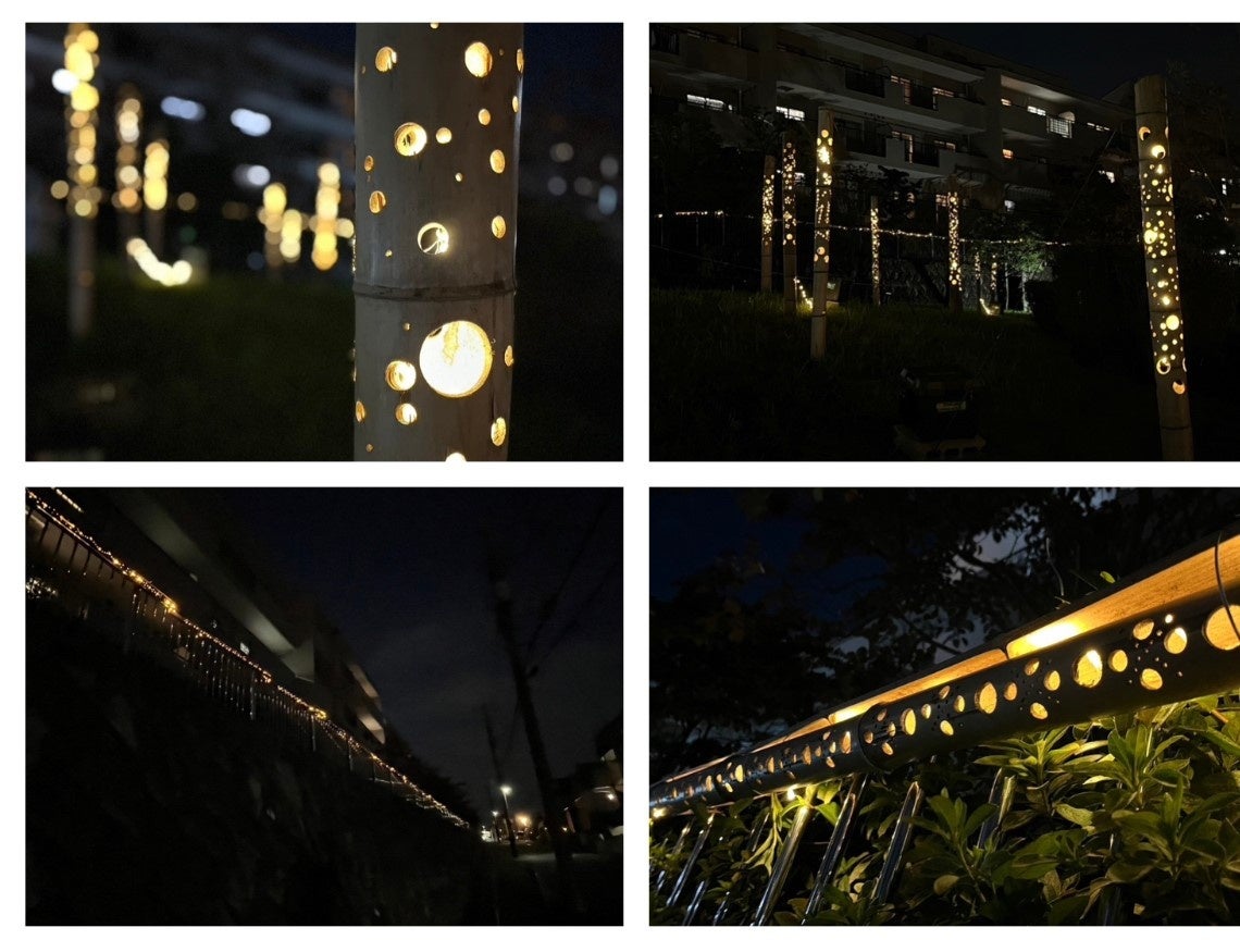 この竹灯籠は、横浜美術大学の教員と有志学生が園内の環境整備のために伐採した竹を使用して制作したもので、秋の涼しい夜に竹灯籠のやわらかなあかりが地域を灯します。
