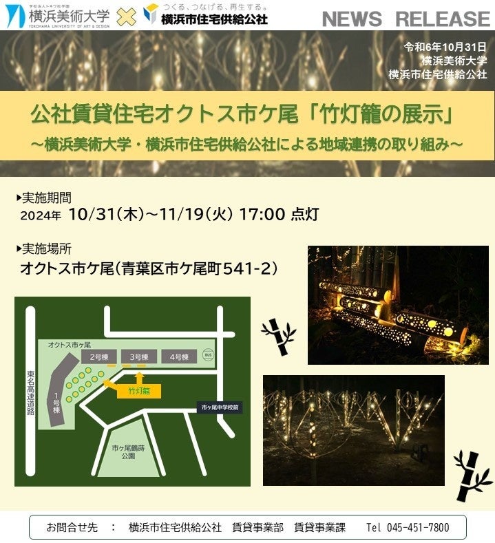横浜美術大学と横浜市住宅供給公社は、地域連携事業の一環として、入居者や近隣住民等の地域交流を促進するイベントを行い、賑わい創出による地域コミュニティ形成や街の活性化に貢献することを目指しています。本日10月31日から賃貸マンション「オクトス市ケ尾」を拠点に人の集まる場やきっかけを作ることを目的として竹灯籠(※)を敷地周辺に設置します。