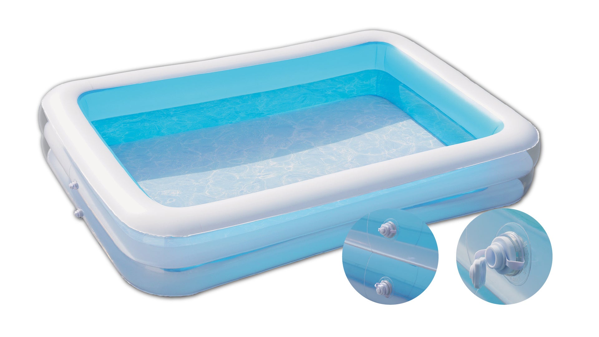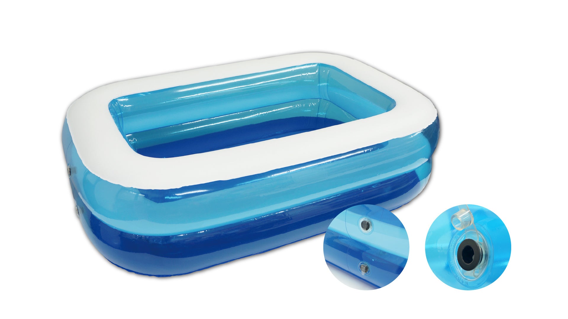 特徴:超ビッグサイズ!最長1.5mの大型ファミリープール。空気を注入するとフチ幅が23cmあるのでしっかり丈夫、2気室構造で安定性がばっちり。2段式バルブなので空気の注入と排出が簡単楽々。ガレージや駐車場、お庭にプールを置いて水遊びを楽しもう♪