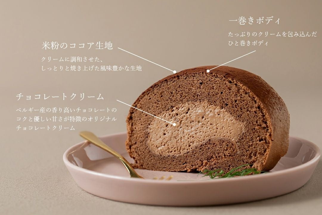 ベルギー産の香り高いチョコレートのコクと優しい甘さが特徴のオリジナルチョコレートクリームを、グルテンフリーの米粉生地で包みこんだ、クリームを存分に味わえる贅沢なロールケーキです。