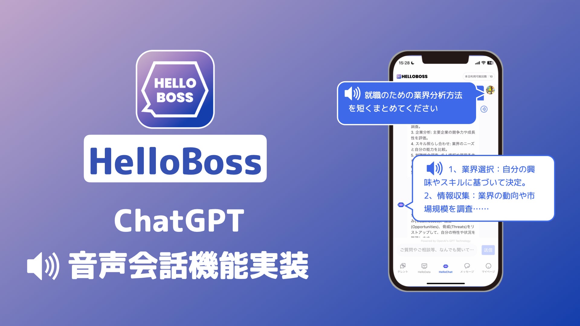 「HelloChat」は、『HelloBoss』正式版のリリース時から搭載したAIチャットサービスです。ChatGPT技術を活用して求職や求人に関するカウンセリングを提供しており、毎日多くのユーザーに使われています。これまでは、チャットの返答が全てテキストのみでしたが、今後、チャットの吹き出し枠の右上のボタンを押すだけで、AIによって作成された返答が音声で読み上げられるようになります。日本語だけでなく、英語や中国語の会話も可能であり、音声読み上げもそれらの言語に対応しています。
