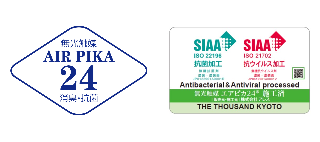 京阪ホテルズ&リゾーツ株式会社(所在地:京都市下京区、代表取締役社長:稲地利彦)は、京都市内のホテル4館(THE THOUSAND KYOTO(ザ・サウザンド キョウト) /京都センチュリーホテル / 京都タワーホテル・京都タワー展望室 / 京都タワーホテルアネックス) の共用スペース主要箇所において、新型コロナウイルス感染防止対策の一環として、光が当たらない状態でも表面に付着する特定のウイルスを減少させる効果がある SIAA 認証「無光触媒 エアピカ 24」のコーティング加工を実施、完了しました。
