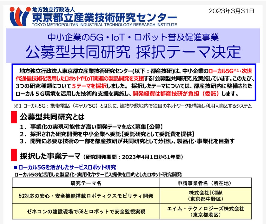 本出展は昨年、東京都立産業技術センターにて募集を行いました公募型共同研究のうち、「ローカル5Gを活かしたサービスロボット研究」に弊社が採択されたことがきっかけとなります。