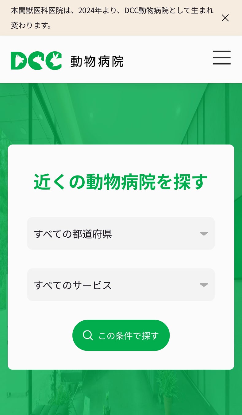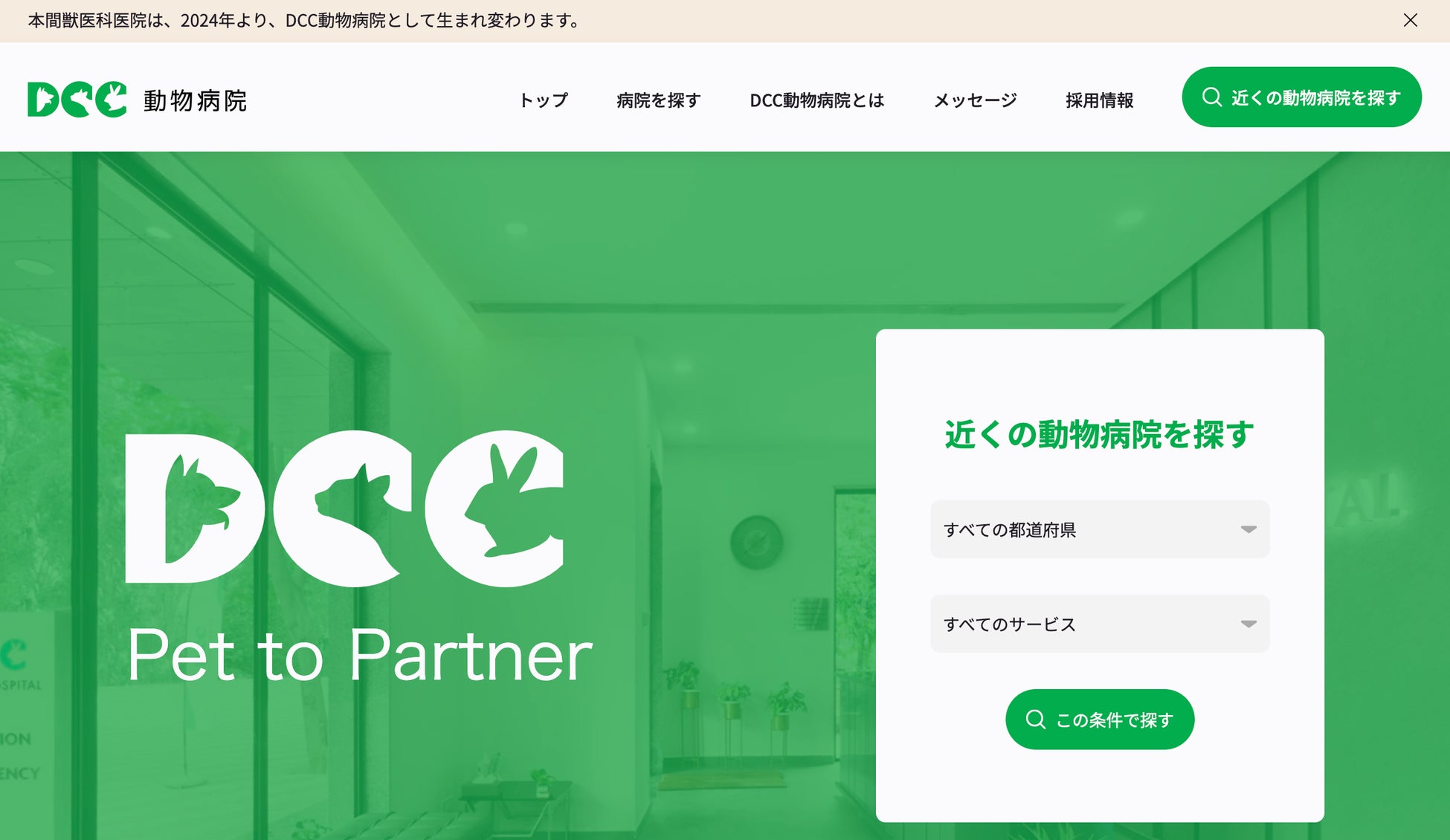 現在、本間獣医科医院 浜松三方原病院をリニューアル第一号店(https://aalda.com/ja/news/202307192082/)として、外装・内装工事や院内で使用する備品、スタッフが着用するユニフォーム等の刷新を進めておりますが、この度、DCC動物病院グループのホームページリニューアルが完了し、10月25日に公開したことをお知らせいたします。