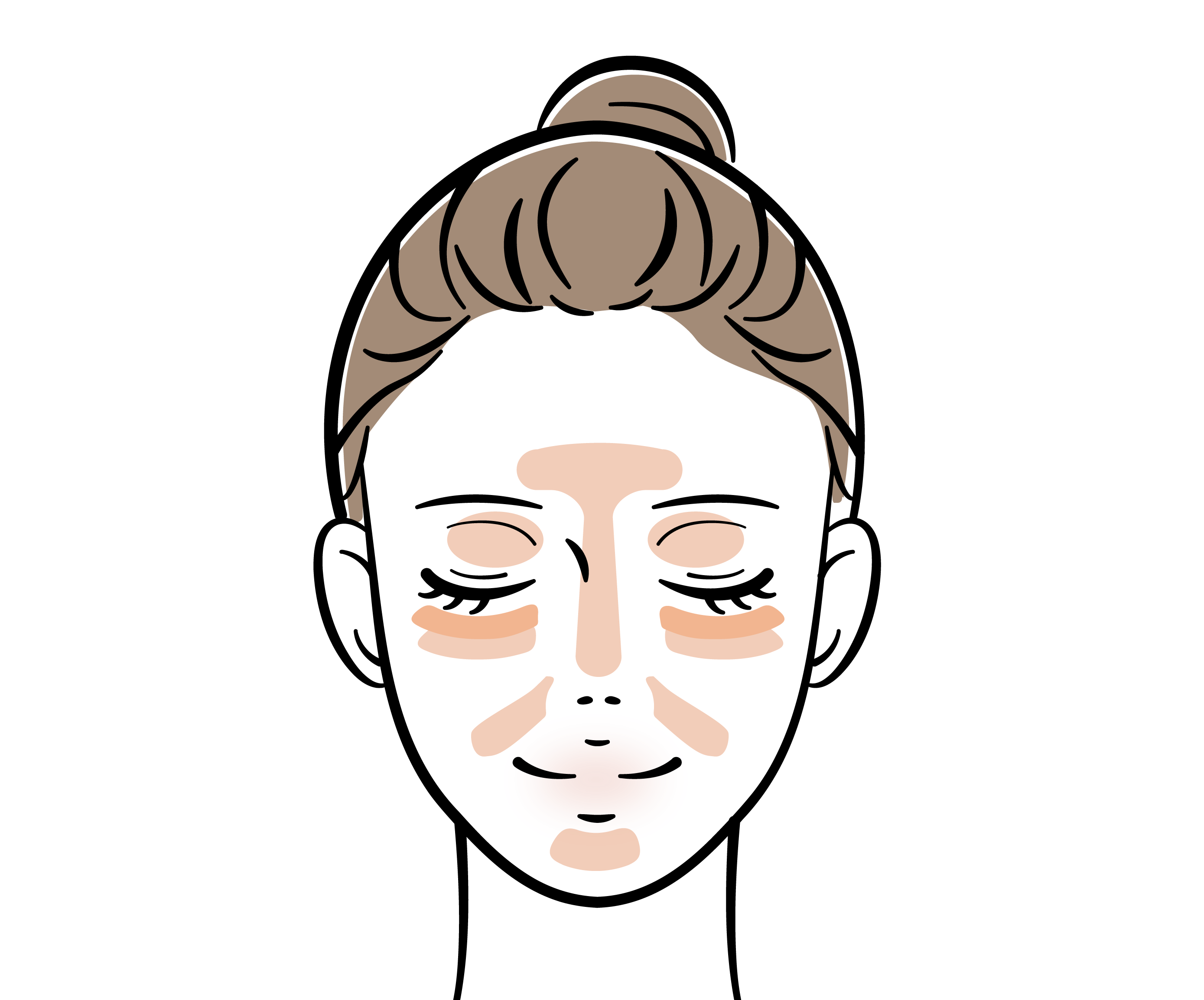 ①基本の塗布箇所:オレンジをクマゾーン、スキンカラーをTゾーン・まぶた中央・頬中央・ほうれい線・あごに付属のコンシーラーブラシを使って、ライン状に塗布。