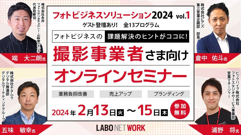 フォトビジネスに携わる事業者を対象にしたWEBセミナーイベント「フォトビジネスソリューション2024 vol.1」を2024年2月13日(火)~15日(木)の3日間、開催いたします。