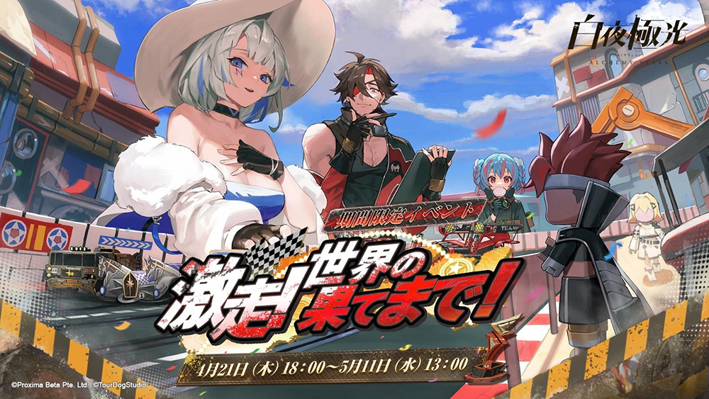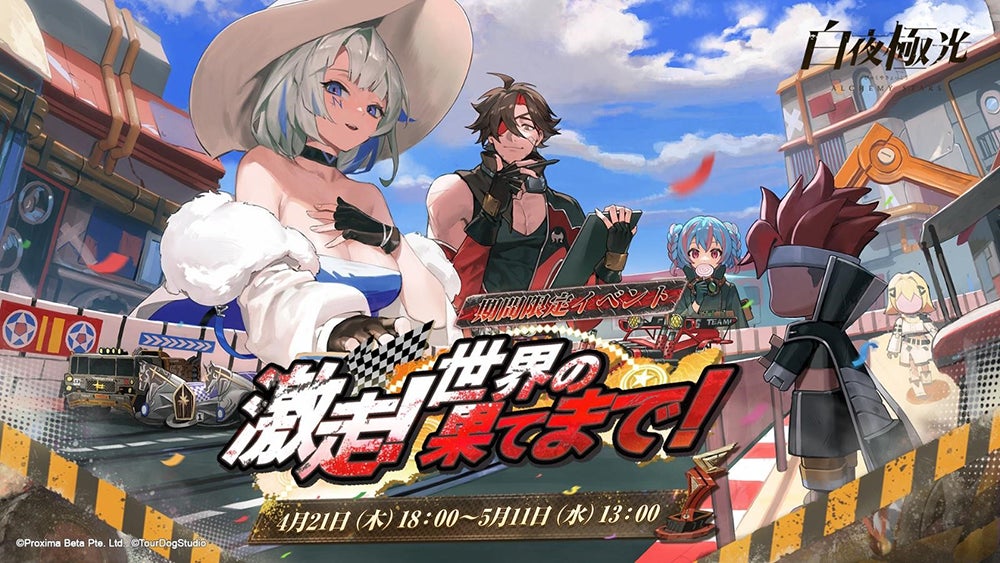 幻想的かつユニークなストーリー、美麗なグラフィック、豪華声優陣による個性豊かなキャラクター等で話題となり、ローンチとともにApp StoreとGoogle Playでランキング1位に輝き、さらに現在登録者数1600万人を突破している『白夜極光(びゃくやきょっこう)』。4月21日より、新期間限定イベント【激走!世界の果てまで!】が開催されます。今回のキービジュアルが象徴するように、本イベントのテーマはレース!愉快!奔放!そしてハチャメチャ!?のユニークなレース大会が開催されようとしています。