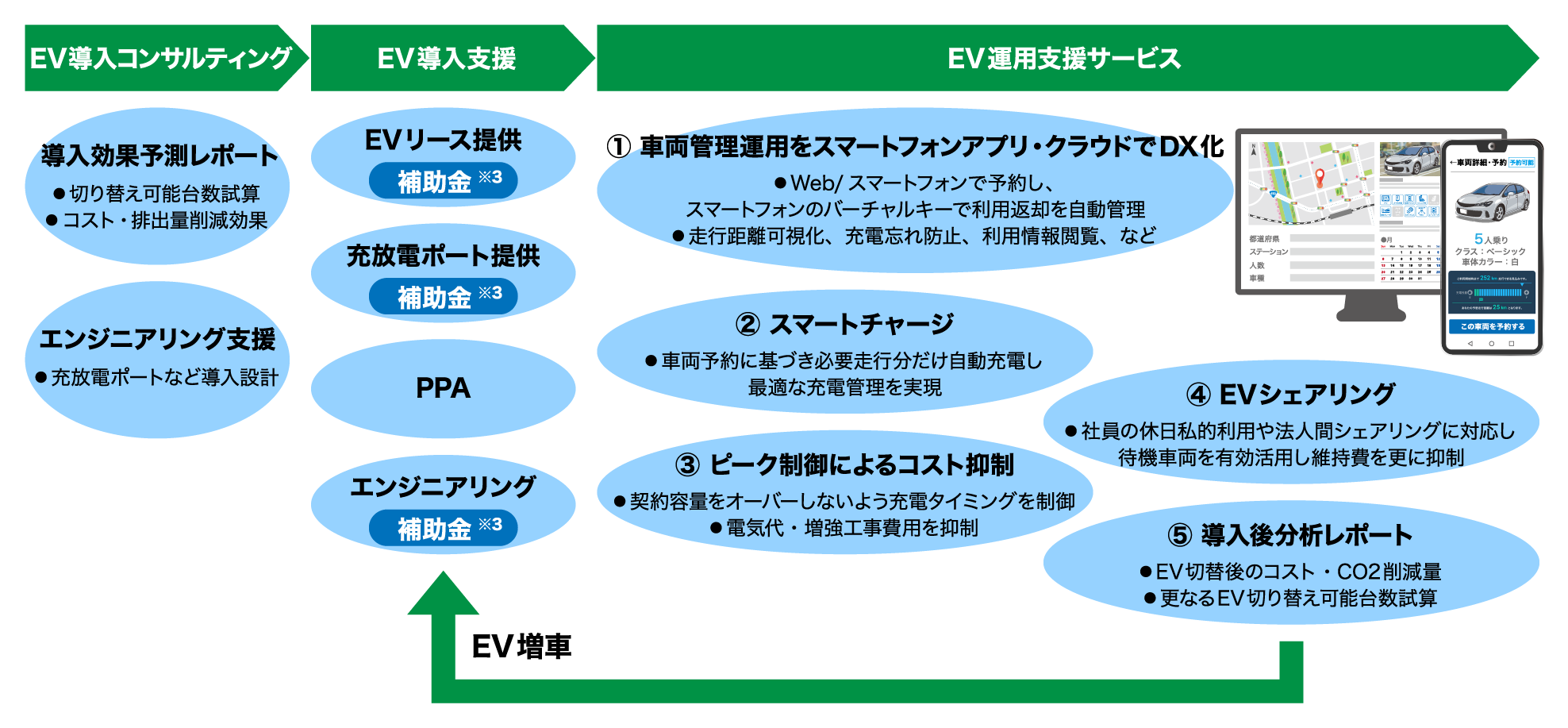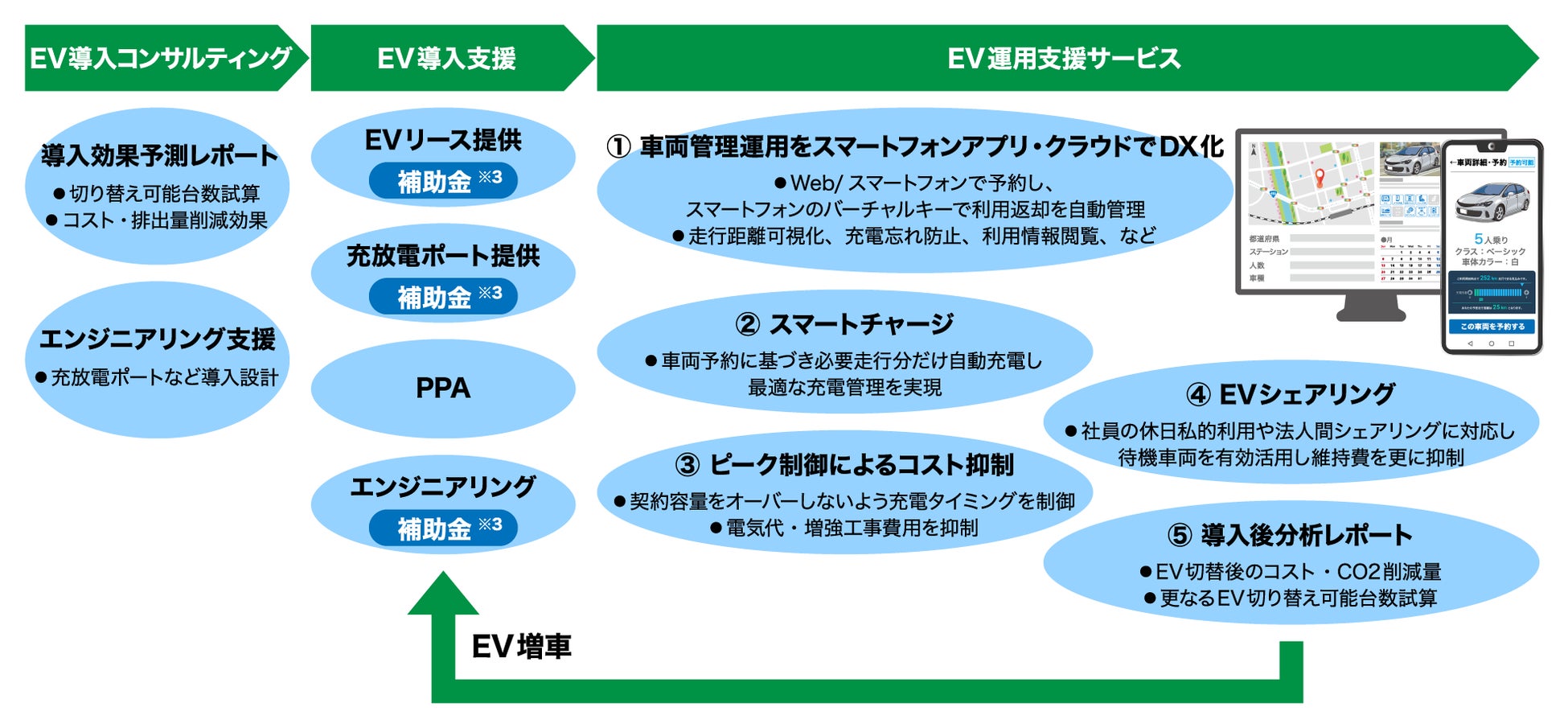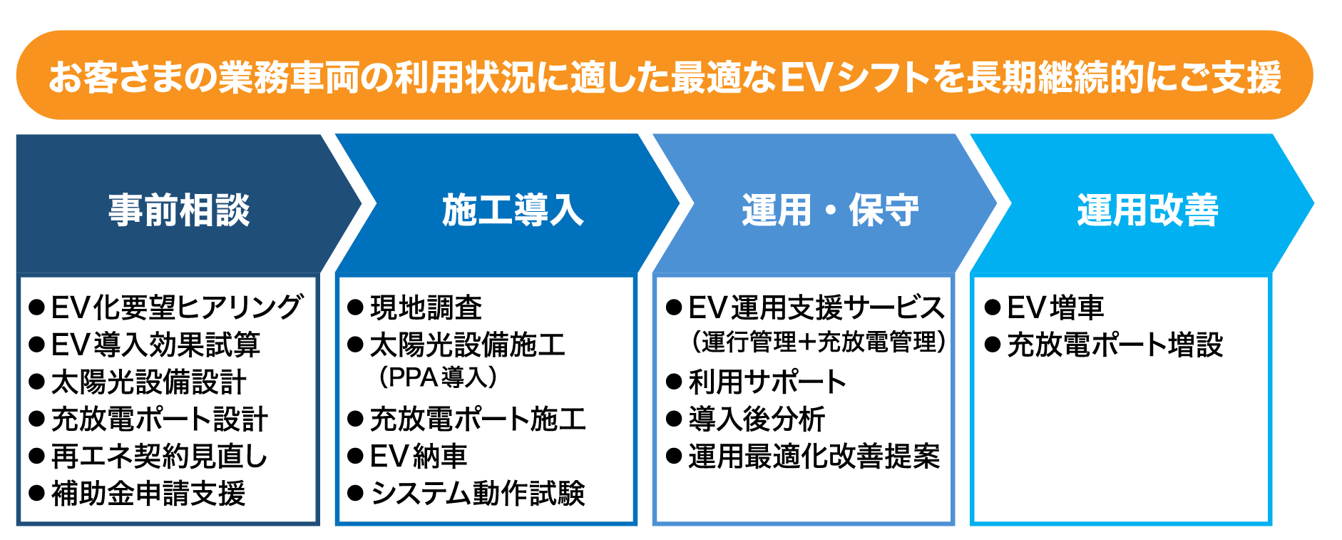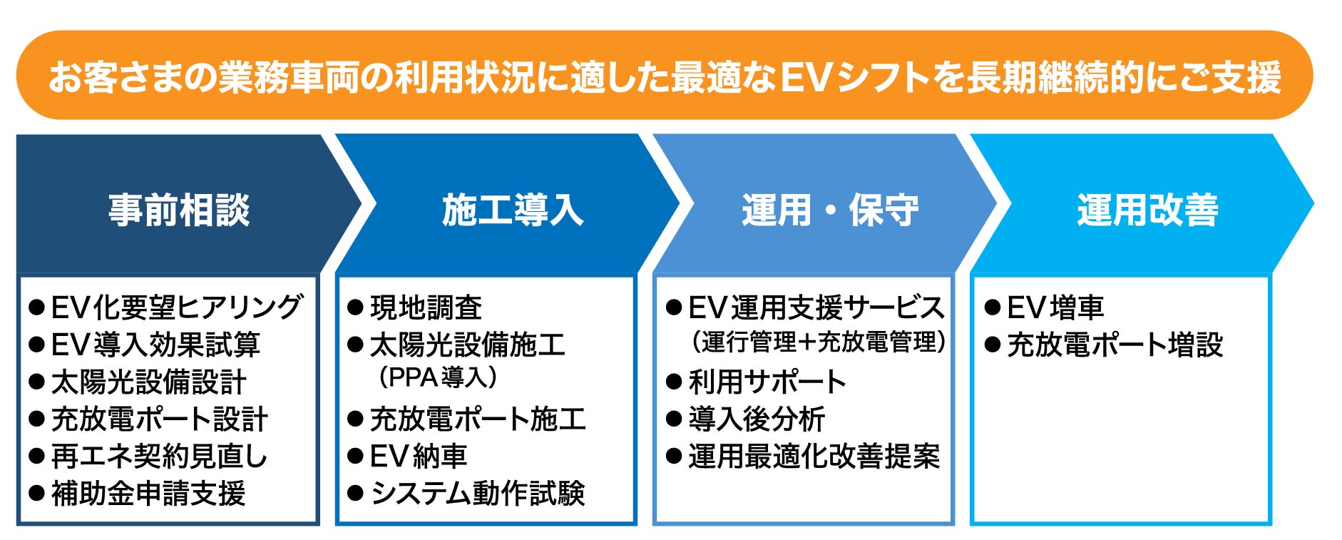 自治体・法人の業務車両のEV化に際して、EV導入効果の分析、EV車両の導入、充放電設備、PPAに活用する太陽光発電設備の設計施工、EV運用時の車両管理、車両利用計画とピーク制御に基づく充電管理、EVシェアリング、導入効果や更なるEV化効果の分析などの機能をワンストップでトータルに提供します。これにより、お客さまの業務車両のEVシフトを継続的に支援します。