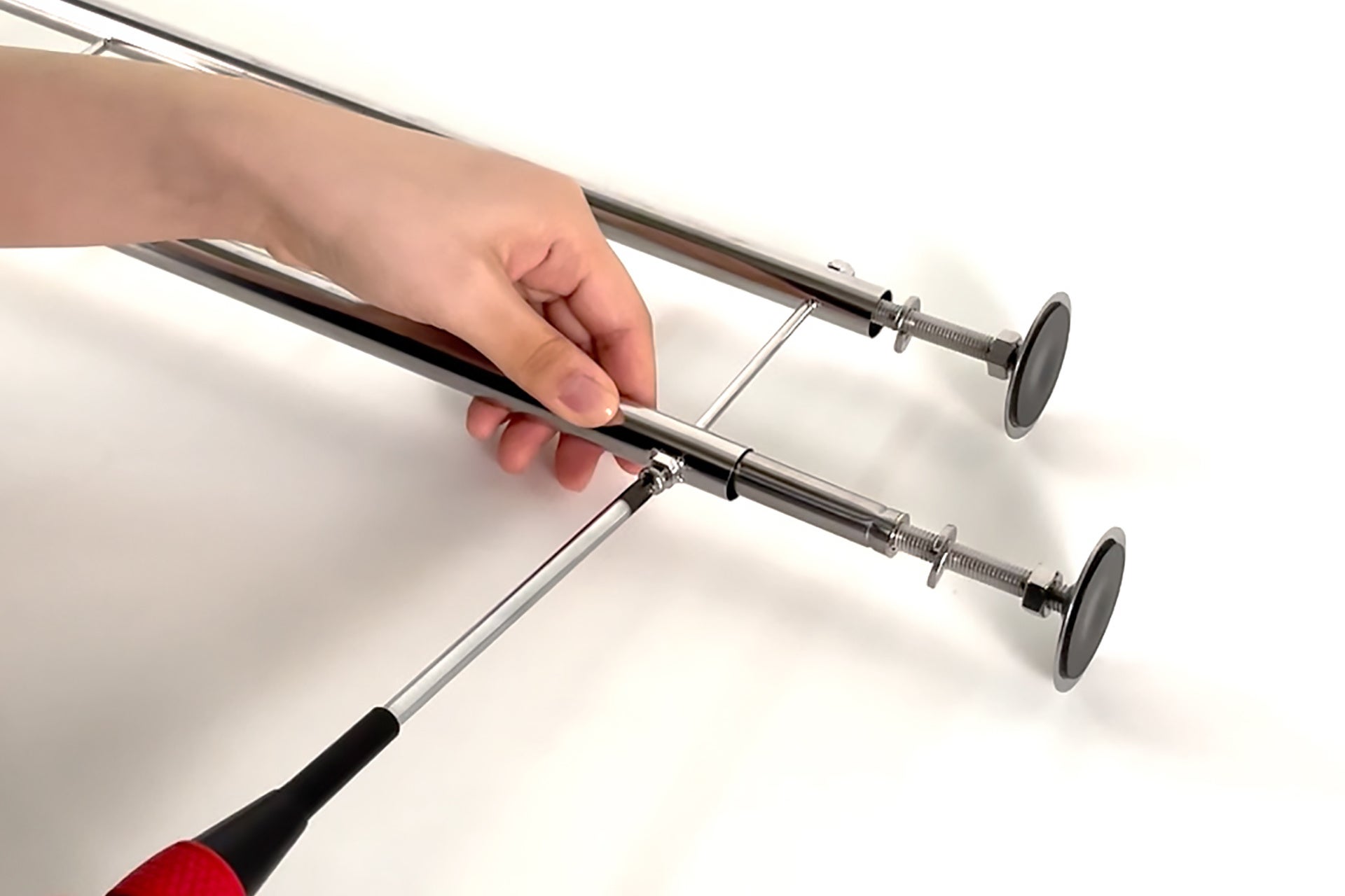 STEP1:設置する場所に合わせて位置と高さを調節しネジで仮止めします。