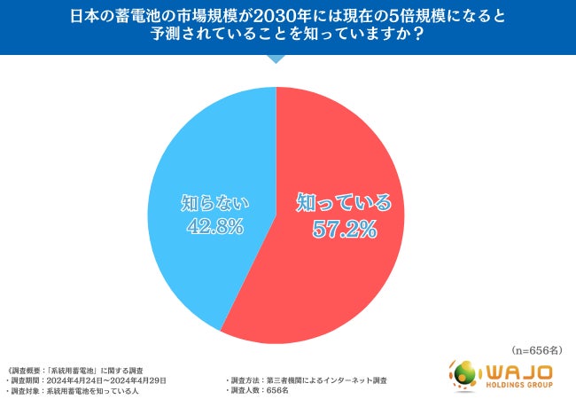 そこで『日本の蓄電池の市場規模が2030年には現在の5倍規模になると予測されていることを知っていますか?』と質問したところ、「知っている(57.2%)」と半数以上ではあるものの、まだ多いとは言えない結果となりました。