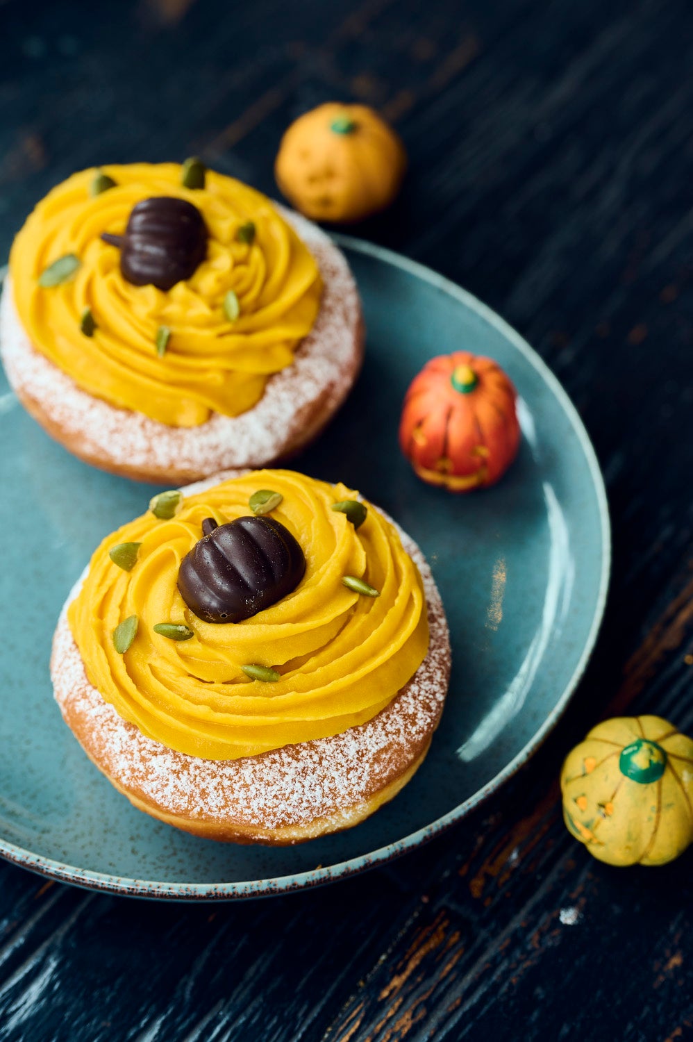 自家製のパンプキンクリームをたっぷりとモンブランのように飾り付け、パンプキン形のチョコをトッピングしました。カボチャ本来の優しい甘さとクリーミーな味わいをお楽しみいただけるドーナツです。