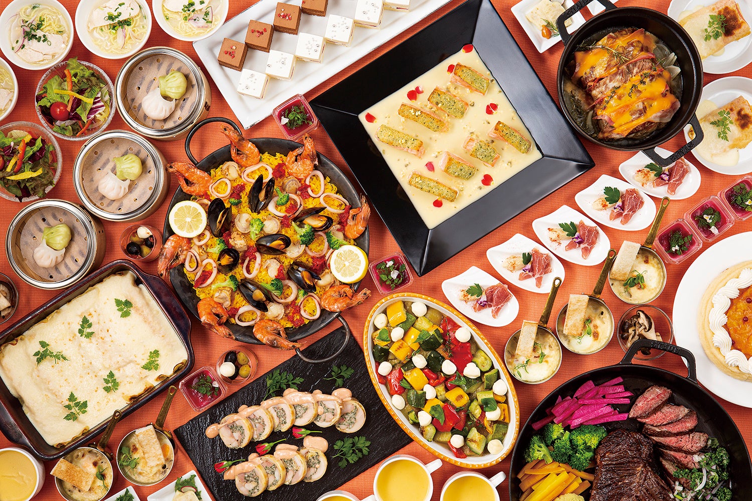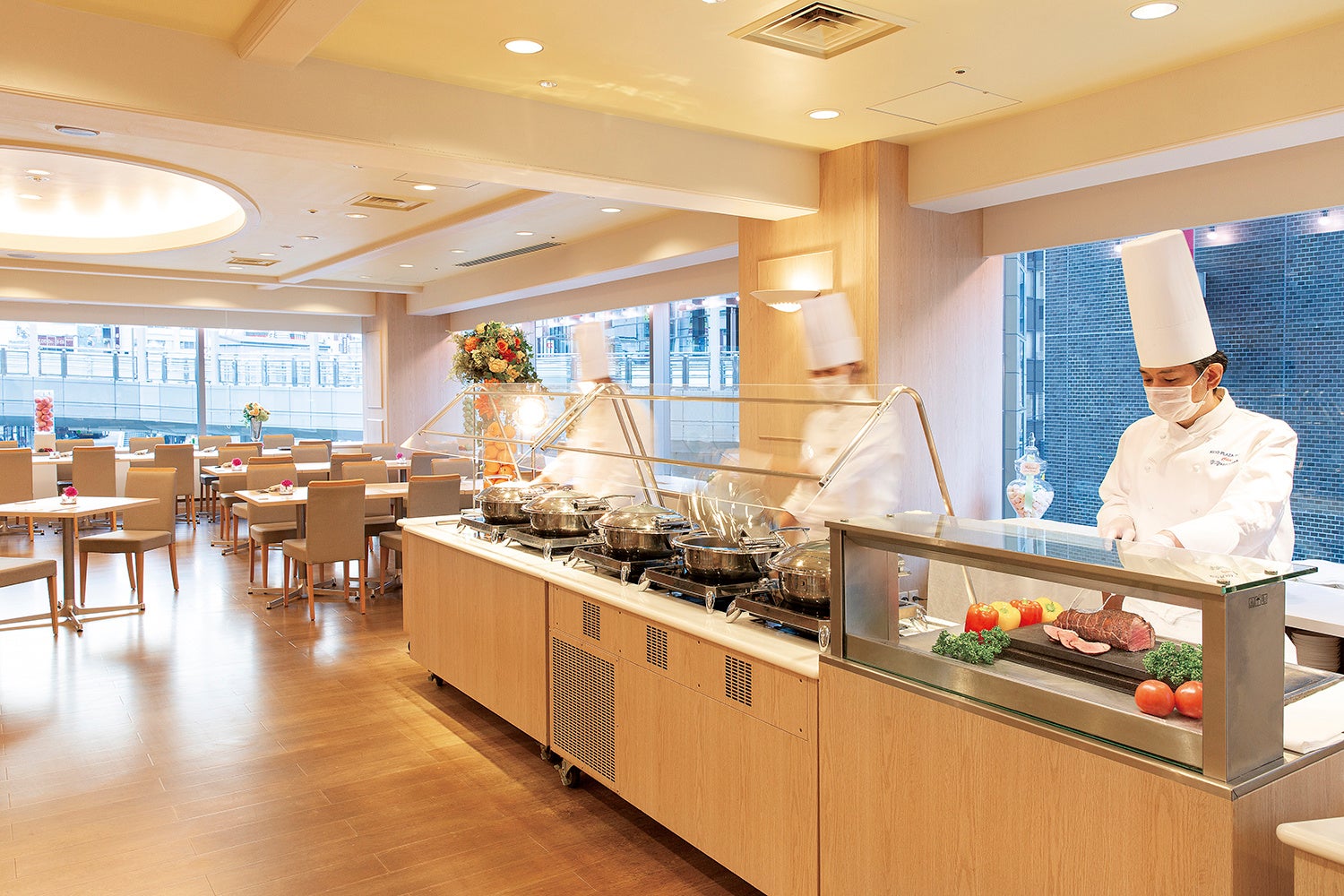 再開記念スペシャルメニューとして、シェフが目の前で切り分けるローストビーフや、チーズで和えるパスタや握り寿司をご用意し、ライブ感を味わえるランチメニューを充実させたほか、冷製料理にはカプレーゼやチキンのハーブロールなどの西洋料理のほかに和食の小鉢を、温製料理には海老餃子や小海老のチリソースといった中国料理もラインナップに加え、和・洋・中・スイーツなどあわせて約40種のメニューをご用意いたしました。月替わりのメニューとして、じっくりと煮込んだポークミジョテやチーズの香ばしさが食欲をそそるサーモンのヴィエノワーズなども堪能いただけるほか、女性には嬉しいホテルパティシエがつくるスイーツと共にフレッシュフルーツやサラダ、パンもお好きなだけお召し上がりいただけます。
