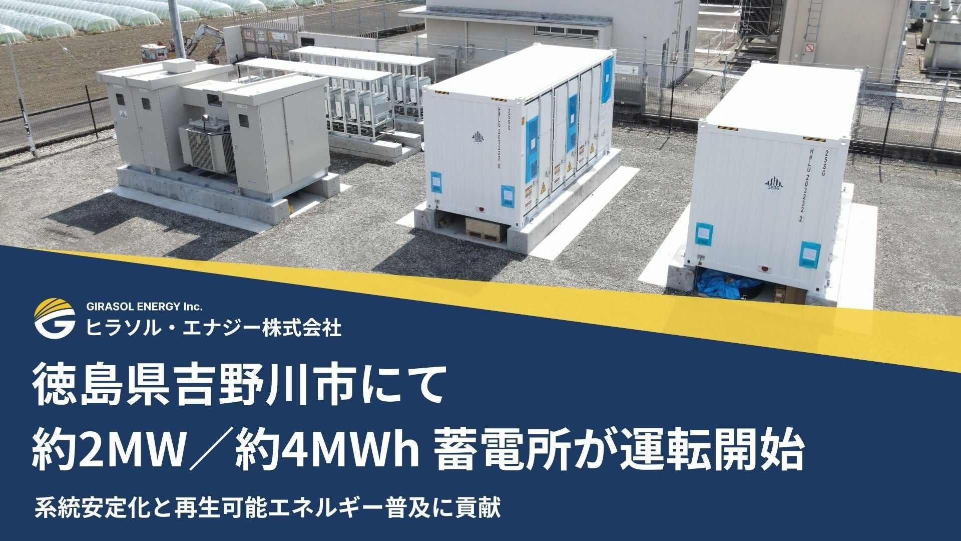 ヒラソル・エナジー株式会社(本社:東京都文京区、代表取締役:李 旻、以下「当社」)は、徳島県吉野川市上浦において系統用蓄電所「徳島県吉野川市上浦系統用蓄電所」(以下、本蓄電所)が2026年4月6日に系統連系し、運転を開始したことをお知らせいたします。