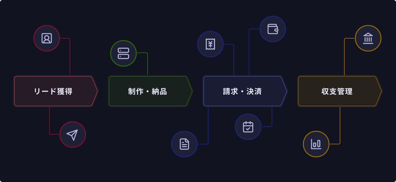 Web上のプロフィールサイトの作成やクライアントからの連絡窓口の開設、請求書や領収書等の帳票の発行、業務全体をマネジメントする進捗管理の機能を実装しています。