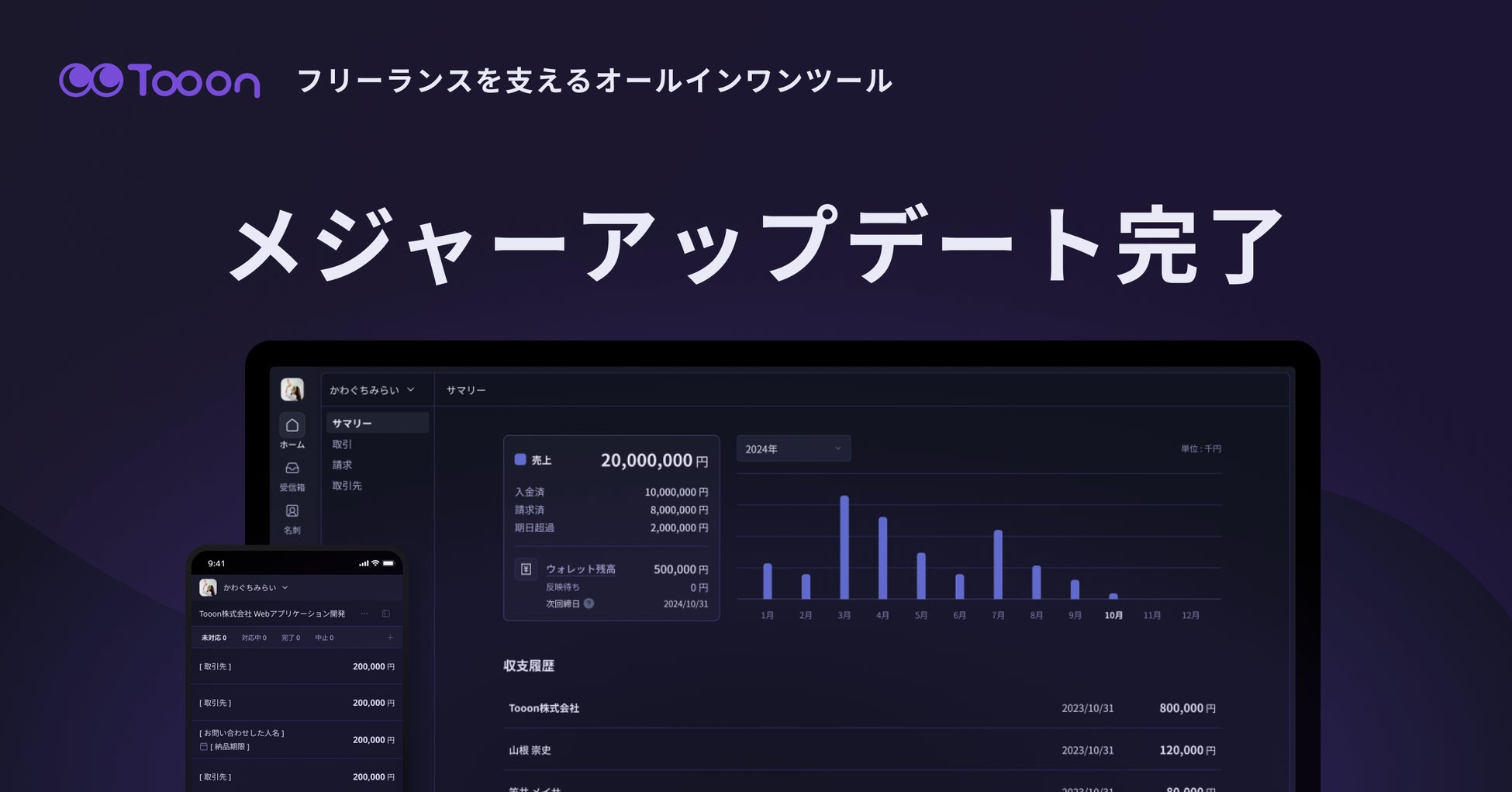 Tooon株式会社はフリーランスや独立クリエイターとして活動する方々の基幹システムを目指し、Tooon(トゥーン)の開発を進めてまいりました。プロダクトのデータ構造やUIUXの改善を進め、2024年4月3日にメジャーアップデートを完了いたしました。