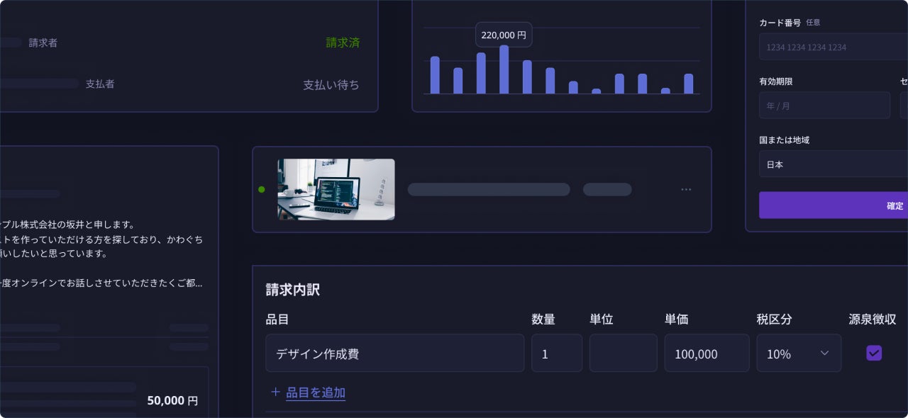 Tooonは、フリーランス・独立クリエイターのビジネス活動を支えるオールインワークスペースです。デジタル名刺の作成・帳票の発行・クレジットカード決済の導入を一気通貫で行い、プロジェクトの並行管理を実現することで削減・効率化を行ってまいります。