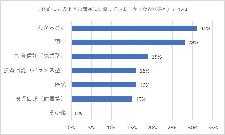 さらに「具体的にどのような商品に投資していますか」と尋ねたところ「わからない」との回答が31パーセントで最多。具体的な回答の中では「預金」が28パーセントと最も多くの回答を集め、以下「投資信託(株式型)」(19パーセント)、「投資信託(バランス型)」と「保険」(ともに16パーセント)、「投資信託(債権型)」(15パーセント)が続きました。