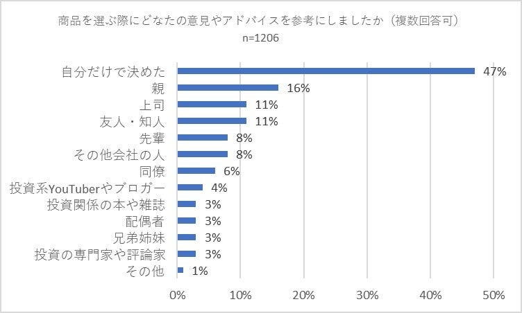 最後に「商品を選ぶ際にどなたの意見やアドバイスを参考にしましたか」と尋ねたところ、「自分だけで決めた」が47パーセントと圧倒的多数の回答を集めました。それ以外では「親」(16パーセント)、「上司」、「友人・知人」(ともに11パーセント)、「先輩」、「その他会社の人」(ともに8パーセント)との結果となりました。