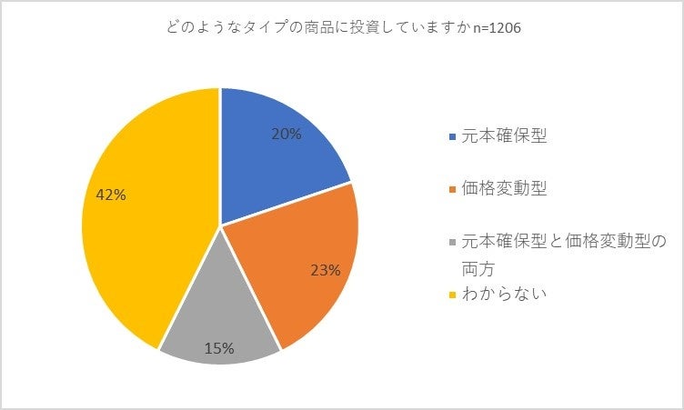 次に「どのようなタイプの商品に投資をしていますか」との質問には「わからない」との回答が42パーセントで最多となりました。具体的な回答の中では、「価格変動型」(23パーセント)、「元本確保型」(20パーセント)、「元本確保型と価格変動型の両方」(15パーセント)との結果になりました。