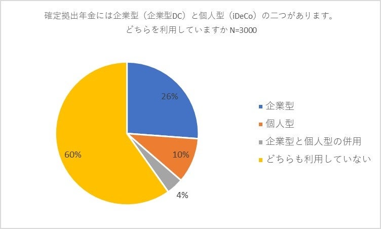 まず、全員に「確定拠出年金には企業型(企業型DC)と個人型(iDeCo)の二つがあります。どちらを利用していますか」と質問したところ、「どちらも利用していない」との回答が60パーセントで最多となりました。利用している方の中では「企業型」が26パーセントで最も多く、「個人型」が10パーセント、「企業型と個人型の併用」が4パーセントとの結果になりました。