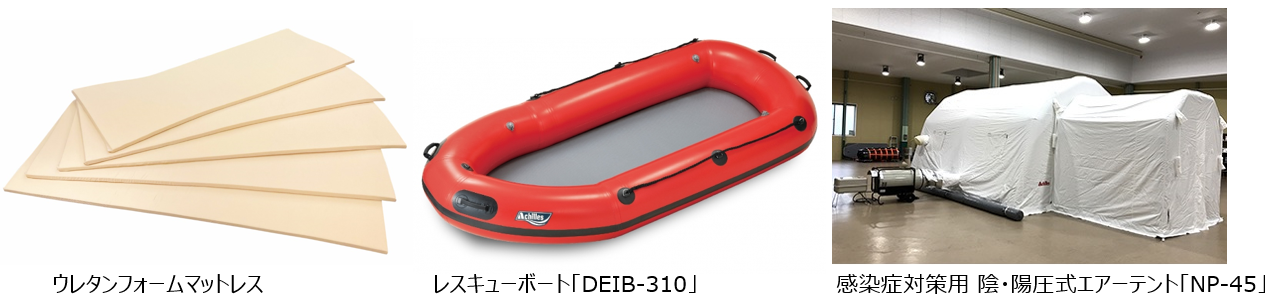 アキレスはプラスチック加工をコア技術に、日用生活品、住宅資材、車輌資材、電子材料やフィルム製品等の多岐に亘る製品群を多様なマーケットに提供しています。事業戦略の重要なキーワードの一つである「高社会性」を軸に、多彩な事業で培った技術を横断的に活用することで、社会的課題の解決に努めています。その象徴的な事業展開として、2021年10月に防災事業部を立ち上げ、エアーテント、レスキューボート、マットレス等の災害現場、避難所で役立つ防災製品の製造・販売をはじめ、防災事業の強化を行っています。