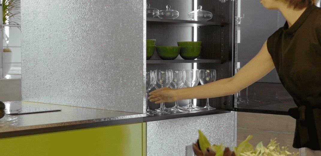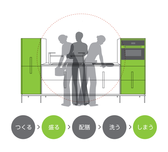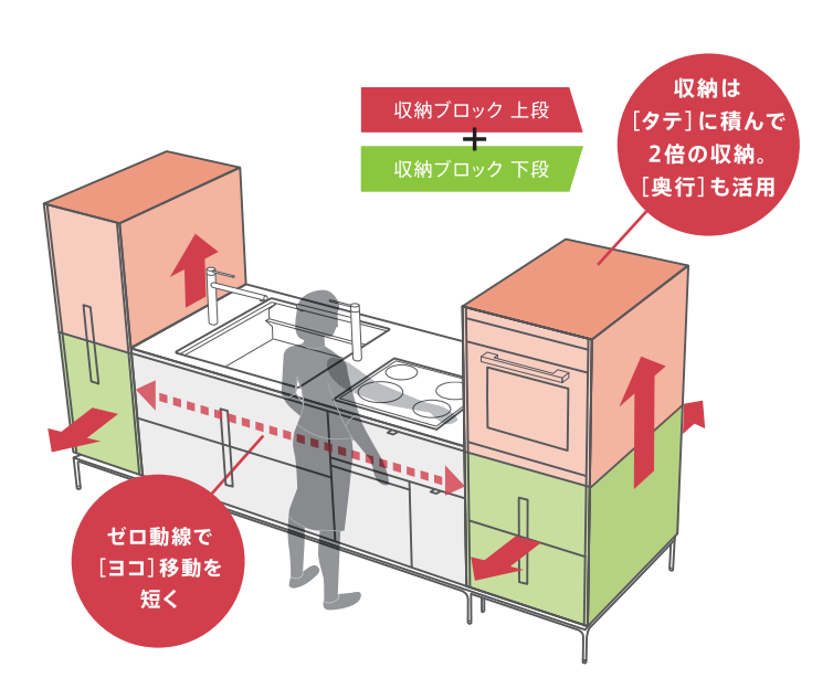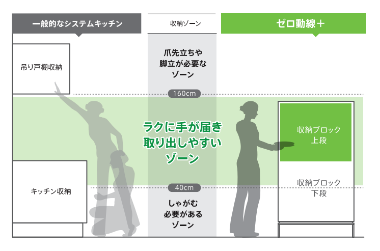 一番使いやすいアイレベルゾーンに、食器や家電を収納。しゃがむ、背伸びするなどの動作が不要で、調理動線のムダをゼロにします。