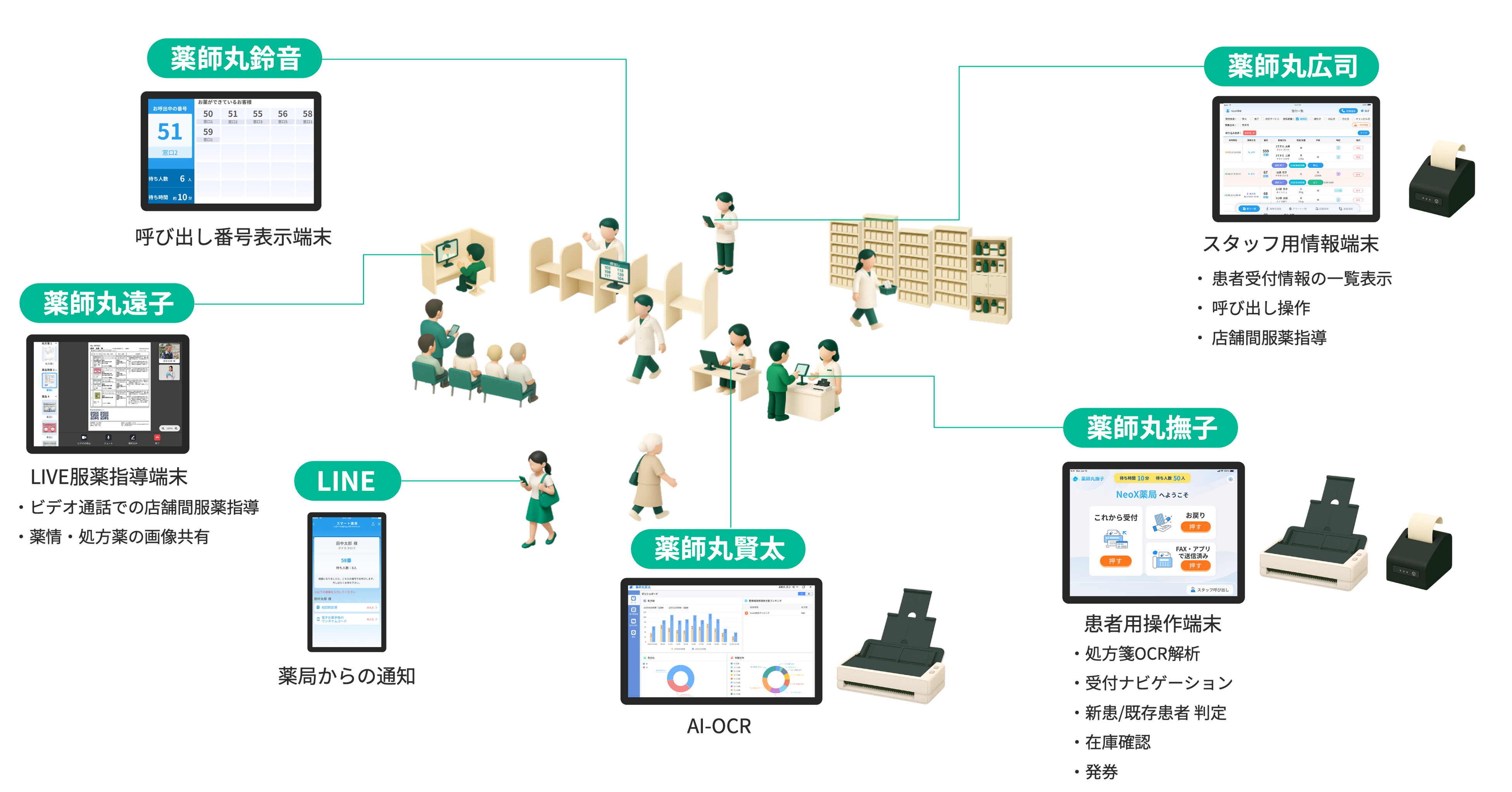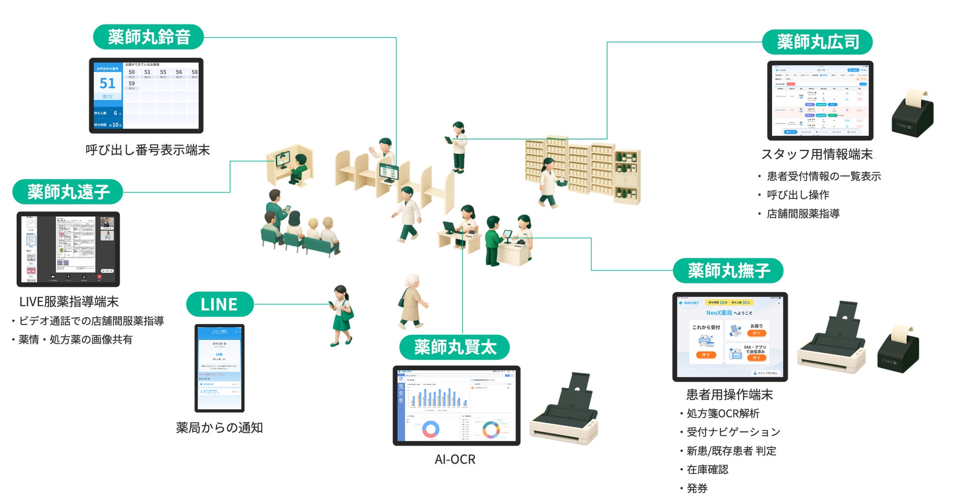また、現場へのヒアリングや運用データの分析を通じて、受付・患者情報・調剤・在庫管理・呼出といった薬局の一連業務を一気通貫で支える「スマート薬局」も展開しています。処方箋入力に加え、薬局業務を点ではなく面で支援する薬局DXソリューションとして、現場の正確性・安全性を支え、業務効率化に貢献します。