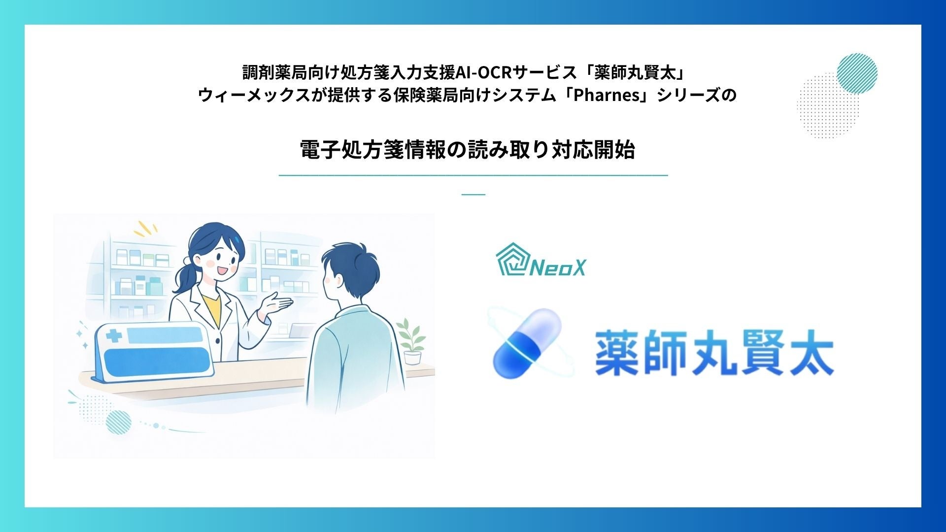 NeoX株式会社(東京都渋谷区、代表取締役:何 書勉、以下「NeoX」)の、調剤薬局向け処方箋入力支援AI-OCRサービス「薬師丸賢太」は、PHCホールディングス株式会社(本社:東京都千代田区、東証プライム:6523)傘下のウィーメックス株式会社(本社:東京都渋谷区、代表取締役社長:高橋秀明、以下「ウィーメックス」)が提供する保険薬局向けシステム「Pharnes」シリーズにおいて、電子処方箋情報の読み取り対応を開始したことをお知らせします。