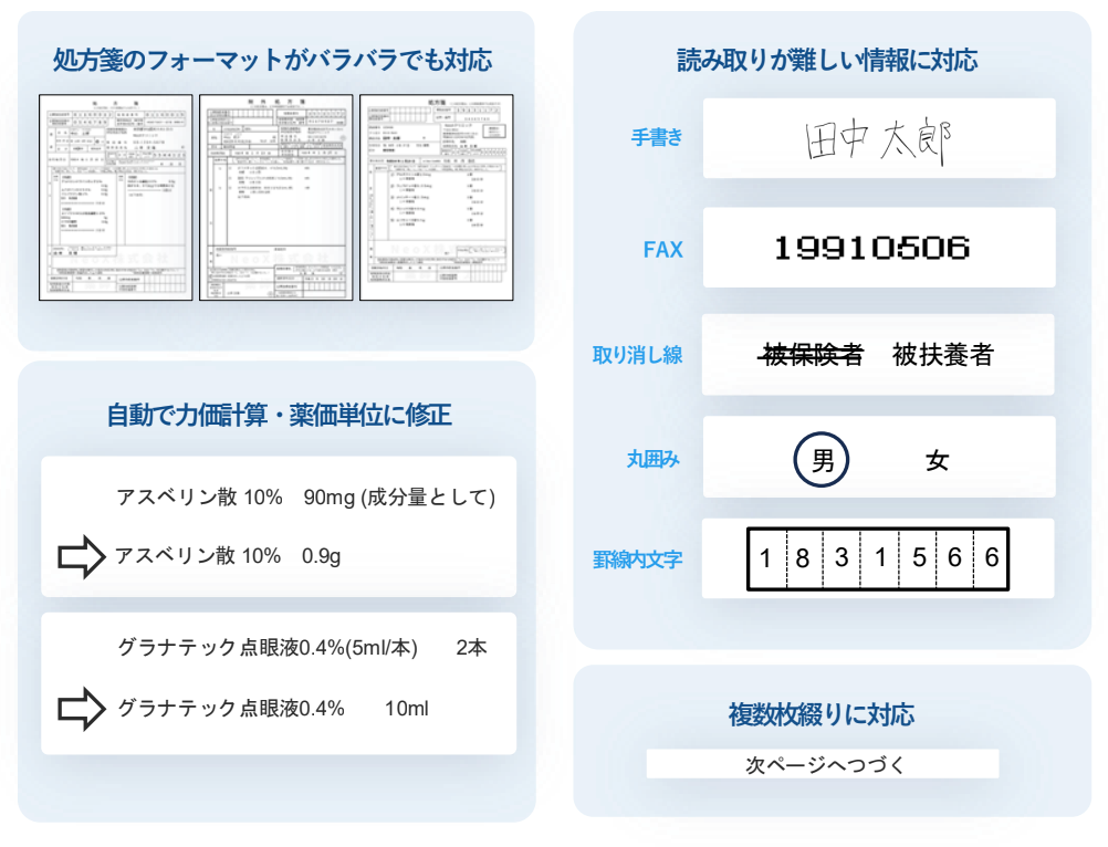 NeoXの「薬師丸賢太」は、現在までに7,000店舗でご利用いただき、累計1億枚以上の処方箋読み取り実績を重ねてきました。処方箋は様式や記載方法が薬局ごとに異なり、フォーマットの違いや複数枚綴りの処方箋など、読み取りが難しいケースも多く存在します。NeoXは実運用の中でこうしたケースに向き合い、読み取り精度の向上と、入力負荷の軽減につながる改善を継続してきました。