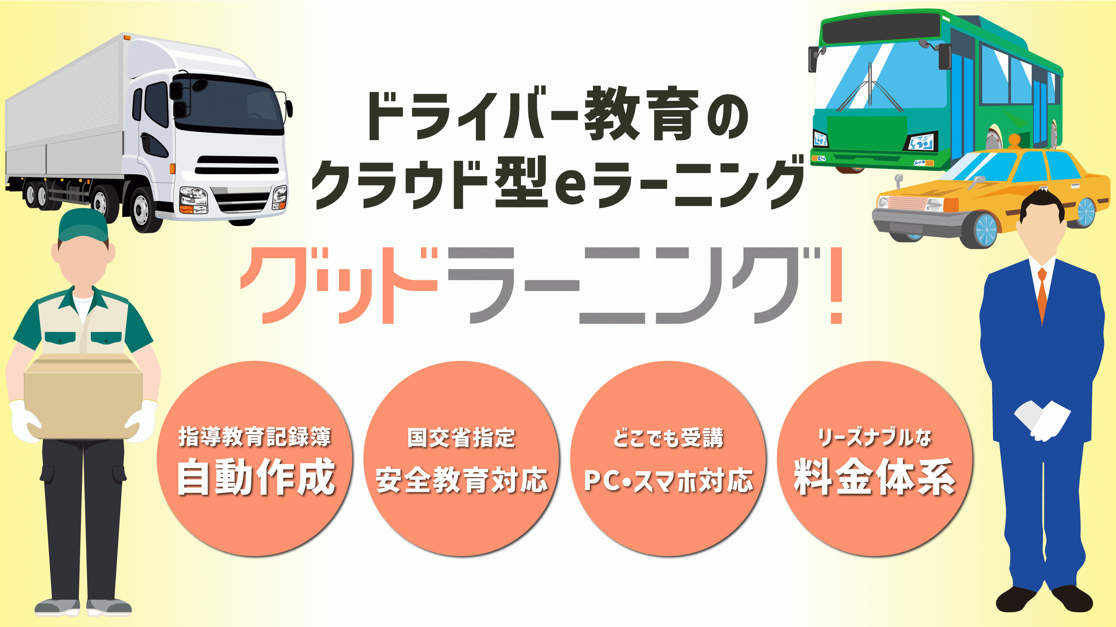 グッドラーニング!は2019年のサービス開始以来、トラック・バス・タクシー事業者の国交省指定・安全教育をeラーニングを用いてサポートし、2023年3月現在700事業者、20,000人を超えるプロドライバーの学習教材として活用されています。全国の多くのトラック協会にも公式教材として採用されており、高い学習効果を得ることができる安全教育プログラムです。グッドラーニング!は、これからもプロドライバーの皆様の安全運転の一助となれるようコンテンツを充実させてまいります。