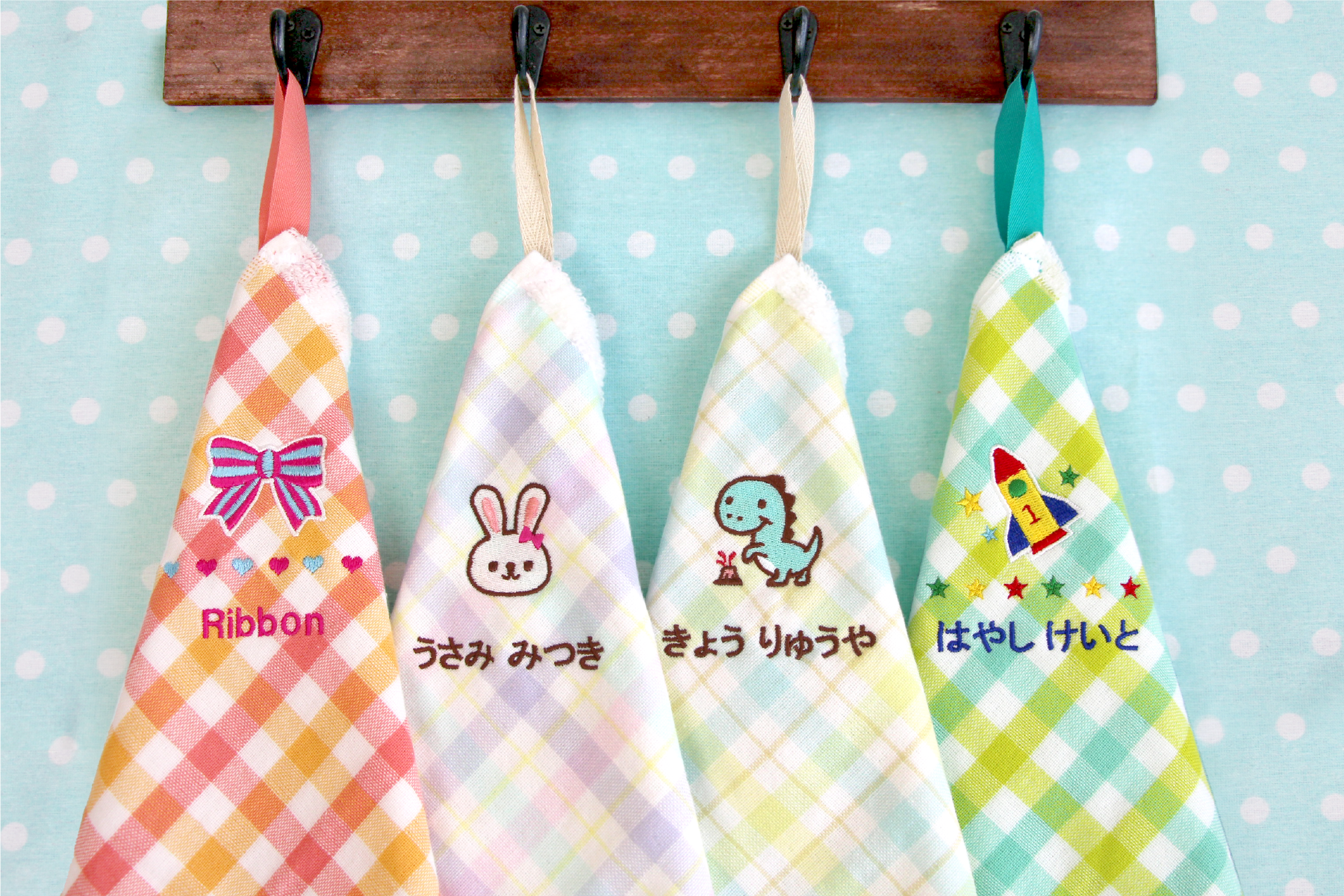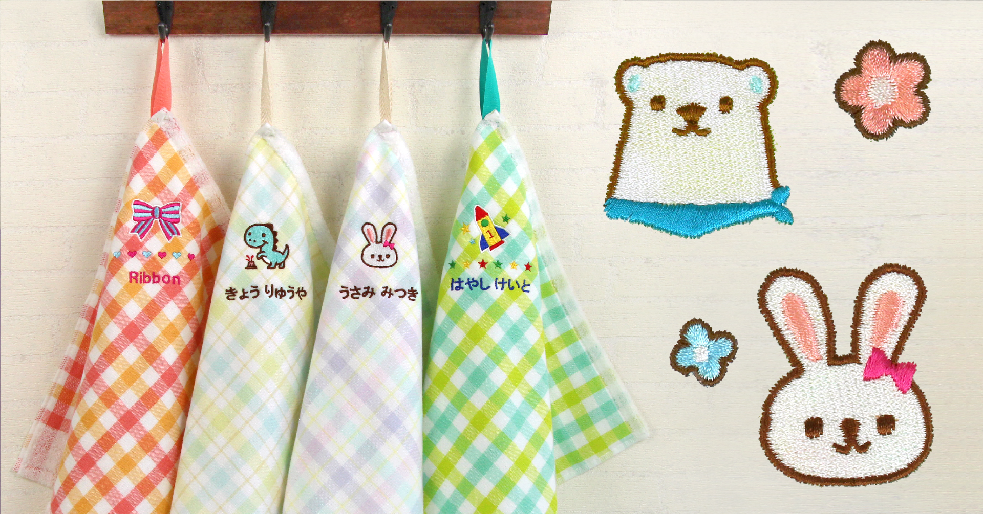 保育園・幼稚園生活につかう名入れループタオルに「キュートな人気イラスト」が仲間入り。さらに、シンプルすぎずカワイさのあるガーゼ&無撚糸タオルにリニューアル!