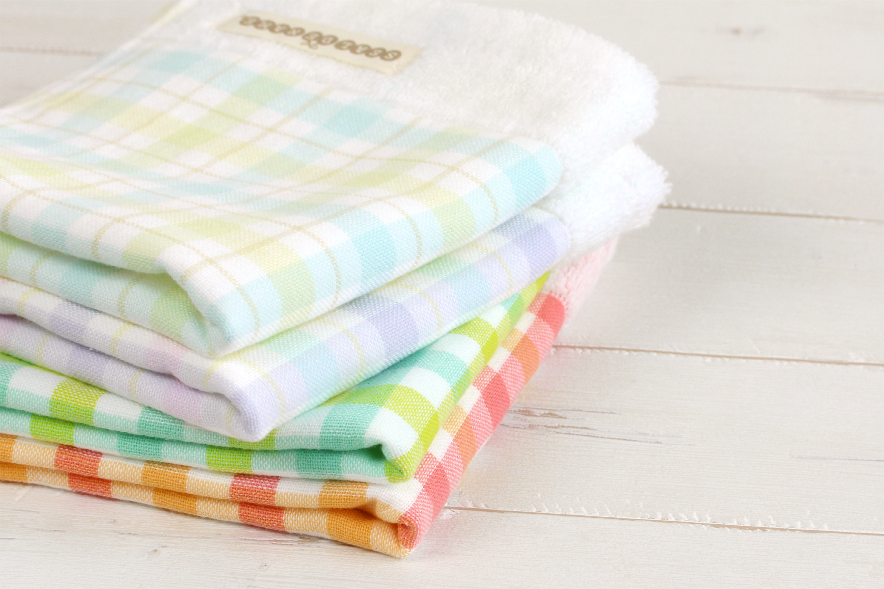 おもては肌に優しいガーゼ生地を採用しました。うらの無撚糸は普通の糸にくらべ、ふんわりやわらかな手ざわりです。繊維のあいだにすき間が多いのでさっと拭くだけでも吸水性が良く、小さなお子さまでも使いやすい生地です。