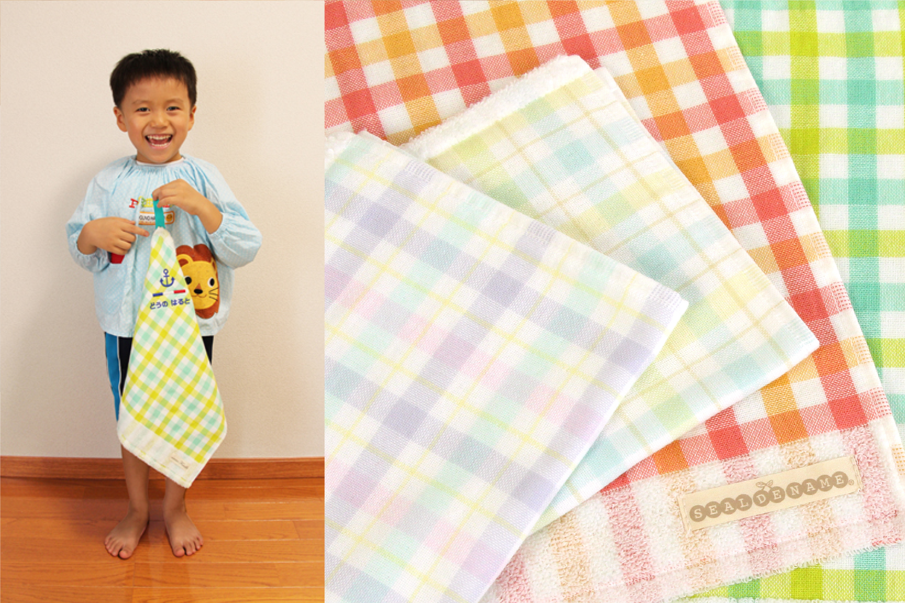 保育園・幼稚園で使用するタオルは、一般的なハンドタオルよりも大判タイプのループ付きを指定する園が多いため、その規格で展開しています。見た目のカワイさだけではなく肌触り等にもこだわっています。