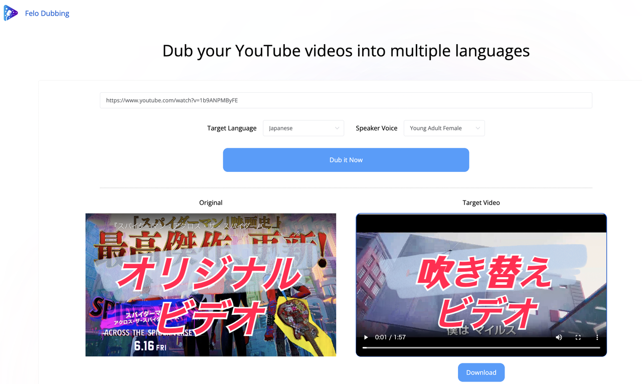 例えば、6月16日(金)に映画『スパイダーマン』最新作が日本全国の映画館で公開されます。しかし、映画の宣伝予告編は英語で公開されています。Felo Dubbingを使用すれば、YouTubeの動画リンクをコピー&ペーストするだけで、その映画の予告編を日本語に翻訳し、日本語の配音付きの新たな動画を短時間で作成することができます。以下の図をご覧ください。「Felo Dubbing」の使い方は非常にシンプルです。まず、変換したいYouTube動画のリンクを「Felo Dubbing」にコピー&ペーストします。次に、言語の選択や声の性別を指定し、変換ボタンをクリックするだけで、わずか数分で新たな言語版の動画が作成されます。生成された動画は、ダウンロードボタンをクリックして簡単に保存することも可能です。