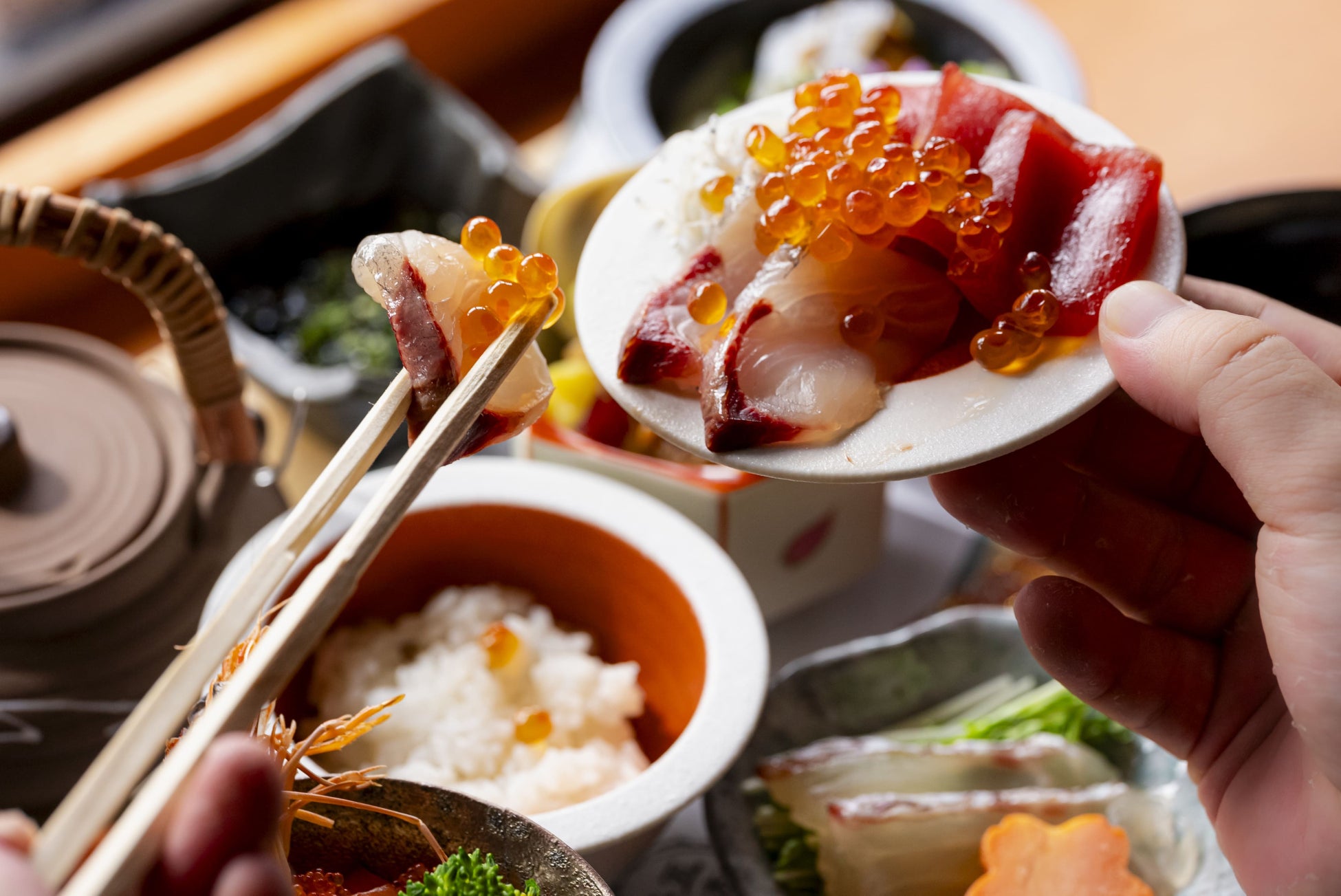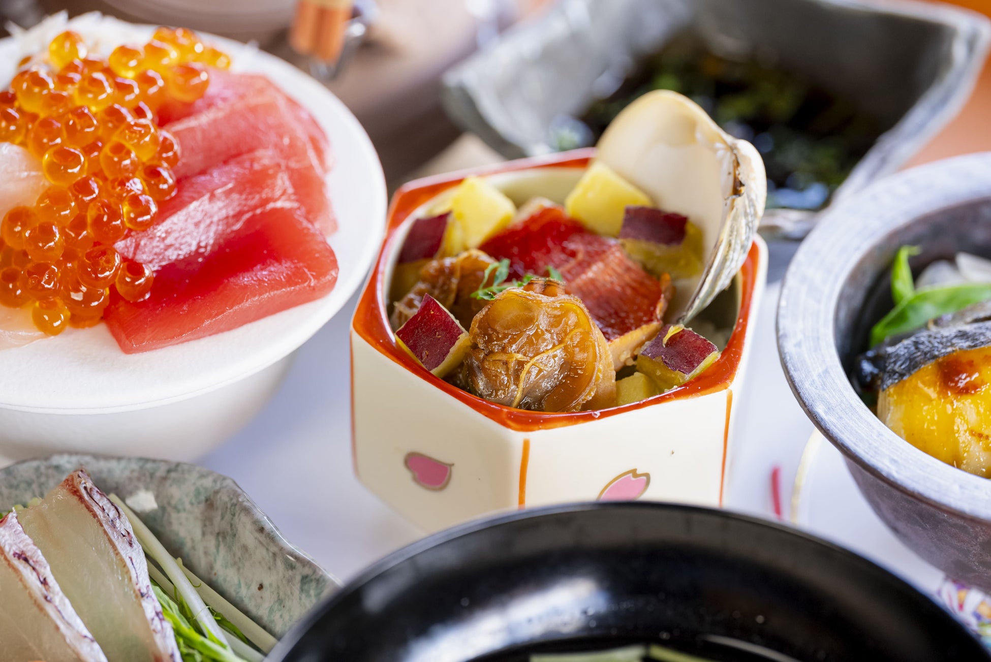 清水店では魚介類のみを使用した特別な京丼をお楽しみいただけます。旬な海鮮は肉厚で上品な脂が乗っており、春の食材と共に丁寧に調理することで様々な京丼に変化します。特別な空間、味わい、華やかさと素朴さをお愉しみください。