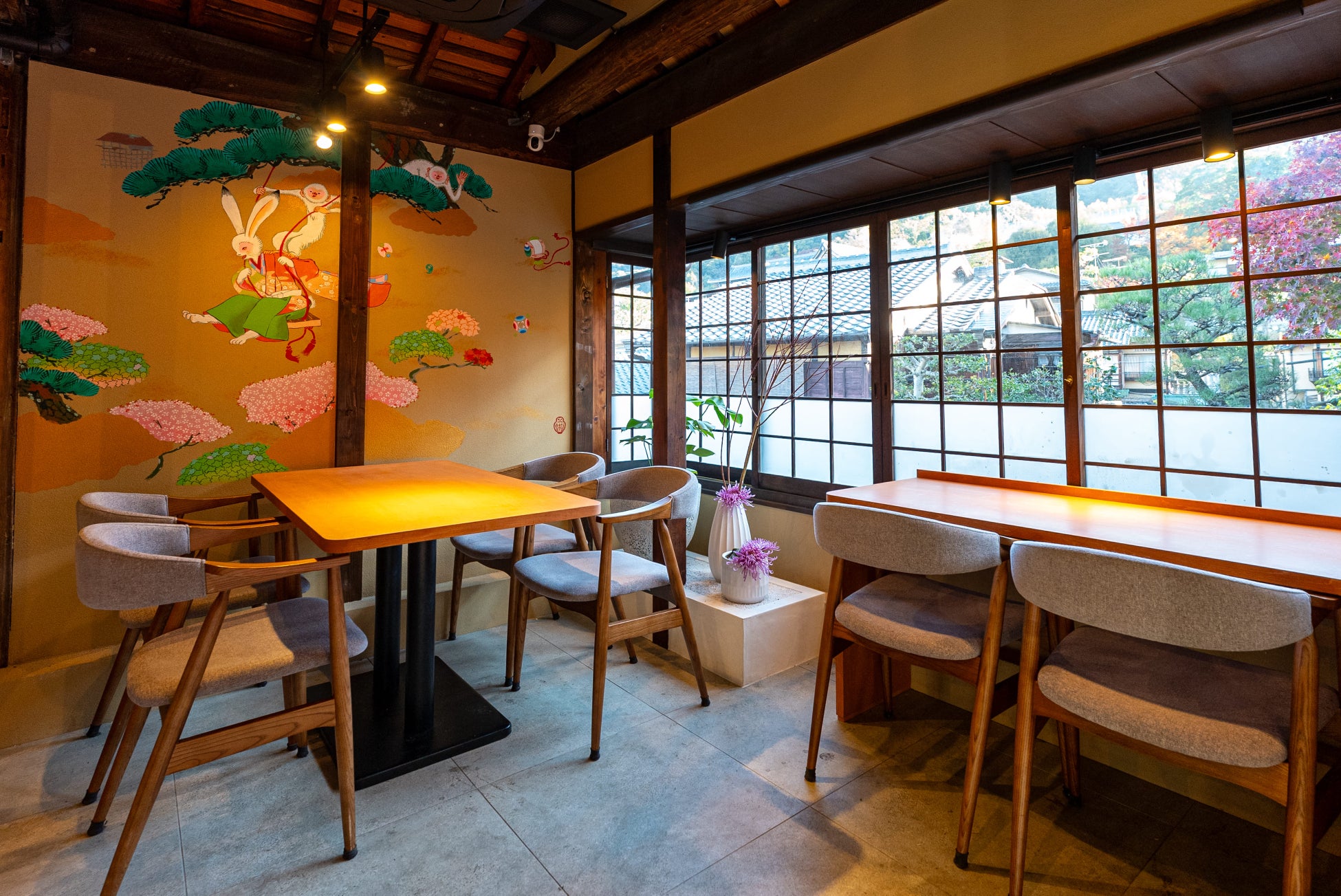 五穀豊穣のお茶屋ごはん®︎ 五木茶屋 清水店は、京町屋の建物と空間で、まるで時間を遡ったかのような感覚でお料理をお楽しみいただけます。ガラス戸から覗く清水の景観から春の季節を感じつつ、食でも京都を体験できるお店です。