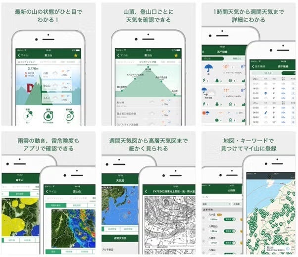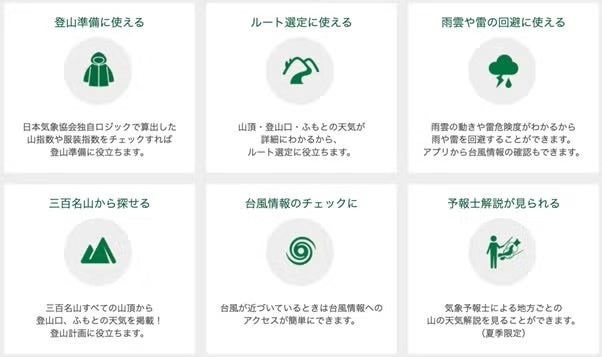 「tenki.jp 登山天気」 は、日本三百名山と人気の山を対象に、麓(ふもと)から山頂までの登山ルート沿いの天気予報や雷危険度などをひと目で確認できる登山者のためのアプリです。登山愛好者に馴染みの深い週間天気図、高層天気図に加え、日の出・日の入りの時間や登山服装指数、紫外線情報も確認することができ、山の気象変化を把握して安全に登山を行うことに役立てていただくことを目的としています。