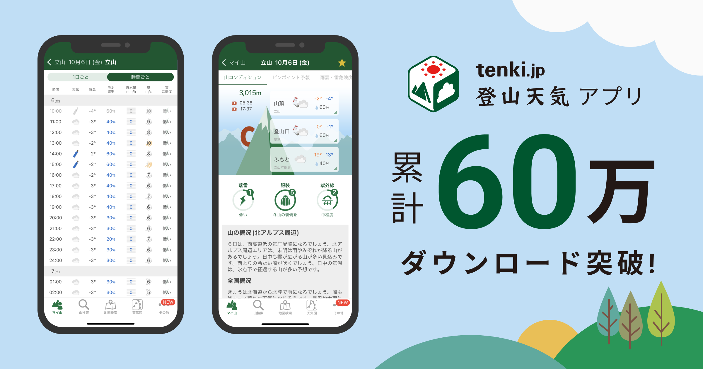 山の天気予報専門アプリ「tenki.jp 登山天気」が累計60万ダウンロード突破!