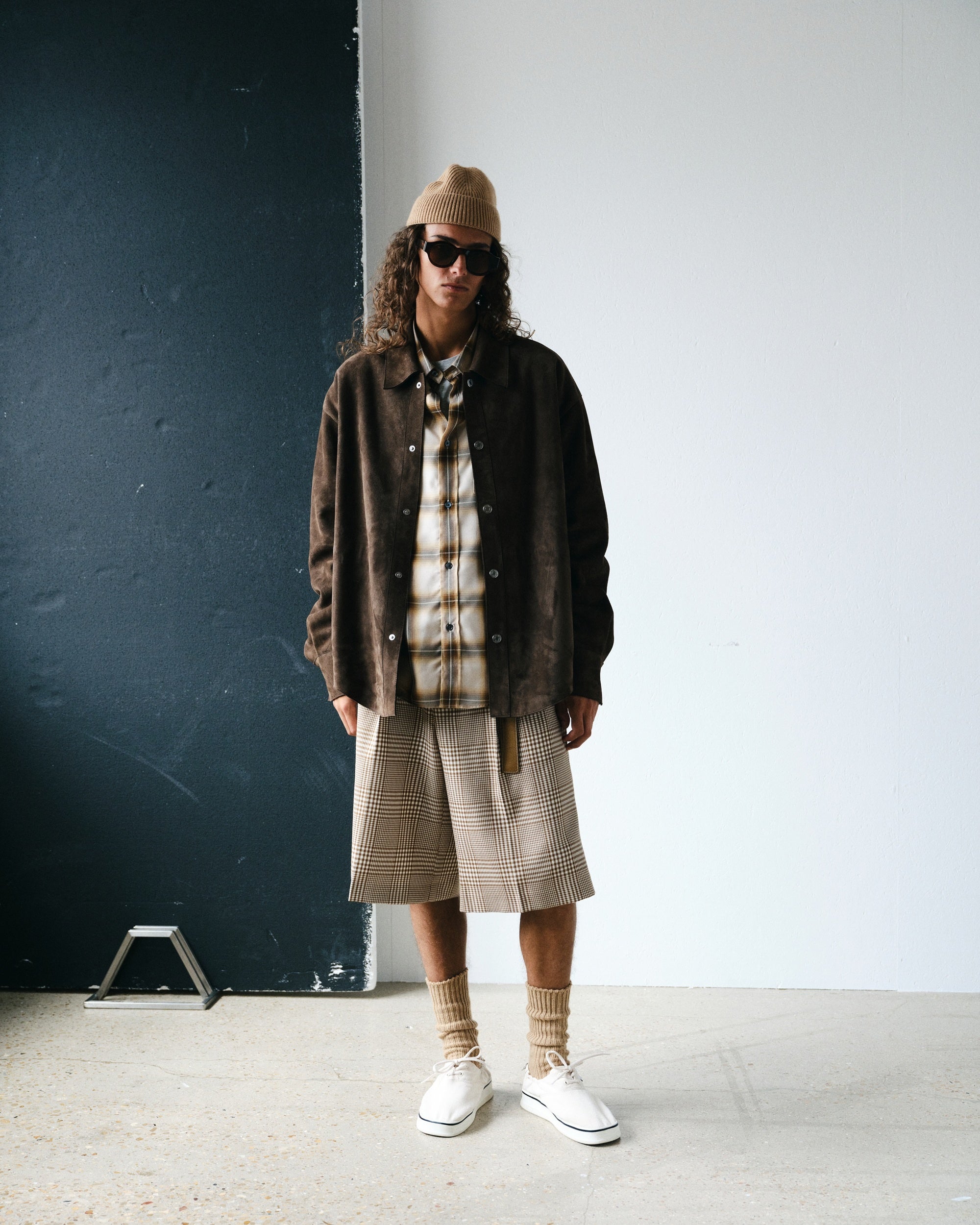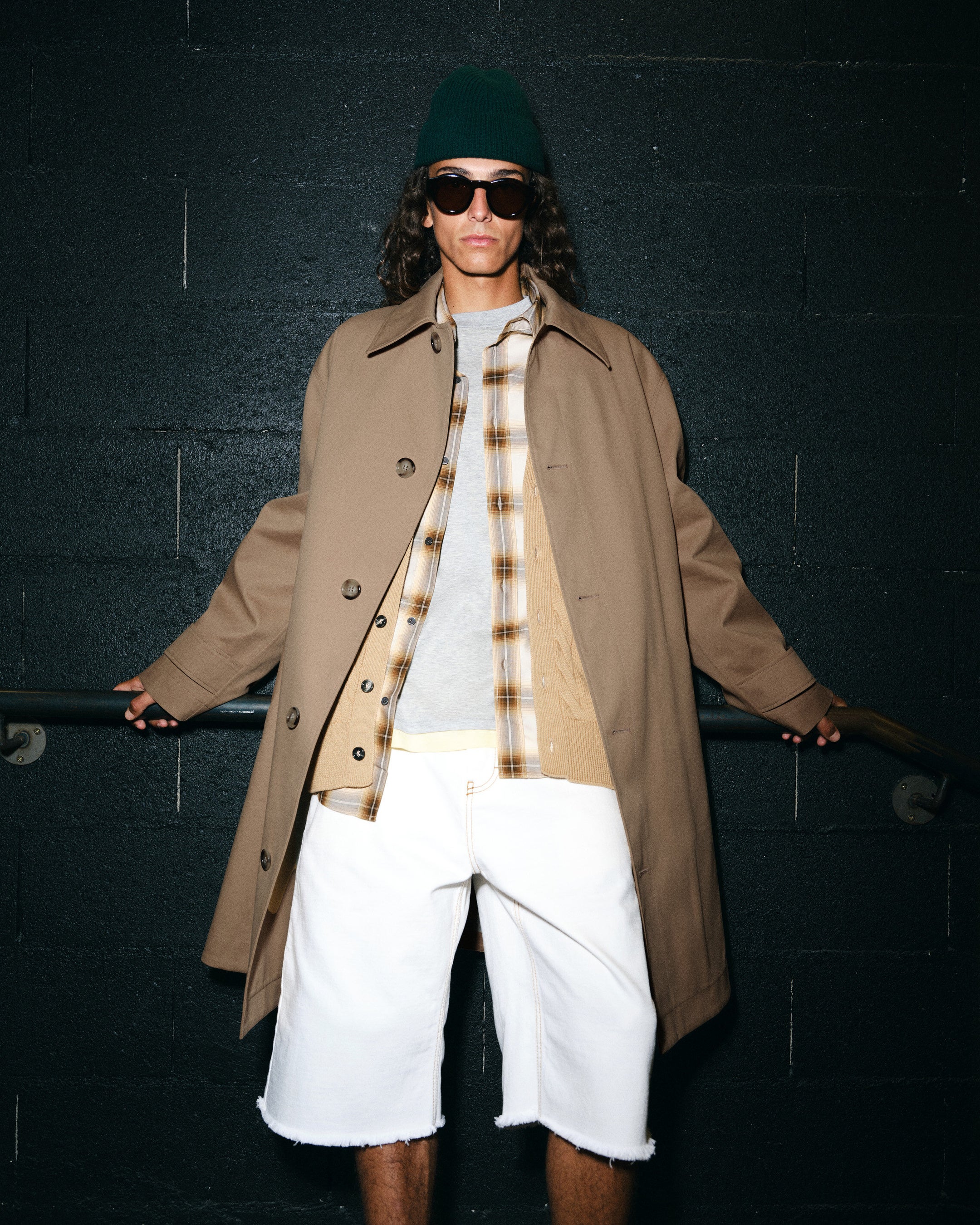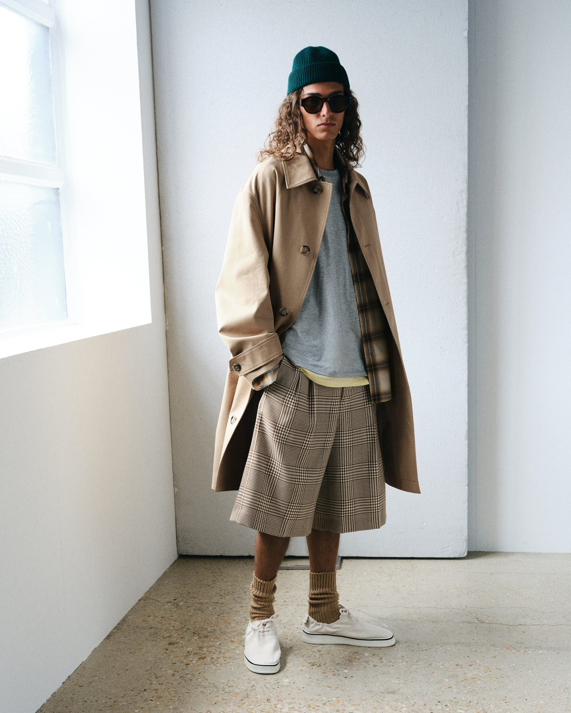 本コレクションでは、構築的なトレンチコートやスエードのオーバーシャツジャケット、軽量ウィンドブレーカーといった、季節の変わり目に最適なシグネチャーアウターが際立ちます。
