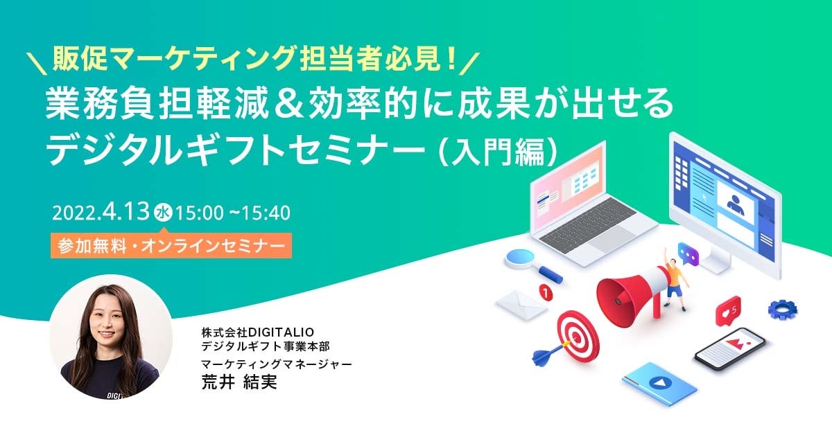 【4/13(水)開催!無料ウェビナー】販促・マーケティングご担当者必見!業務負担軽減&効率的に成果が出せるデジタルギフトセミナー(入門編)